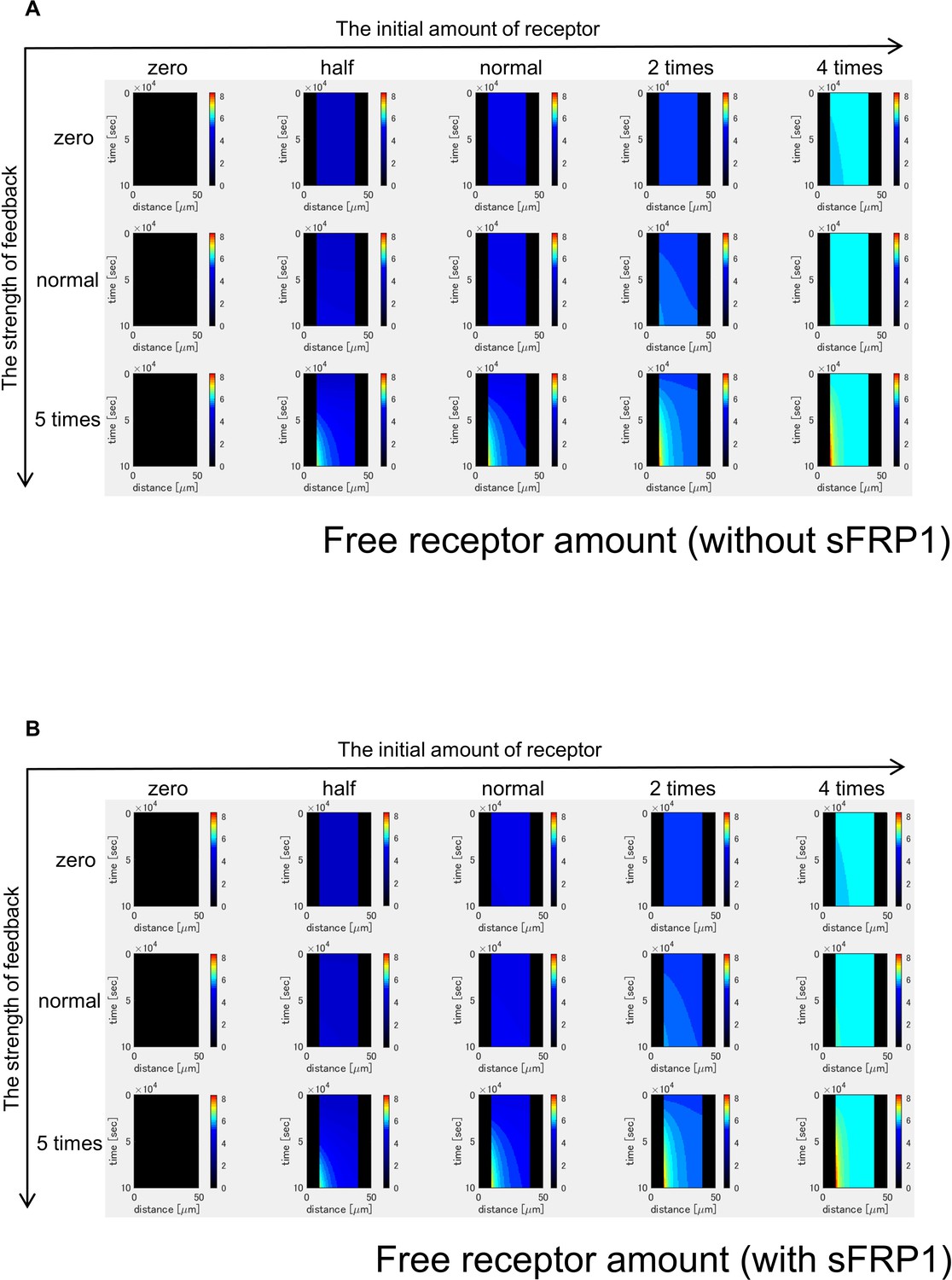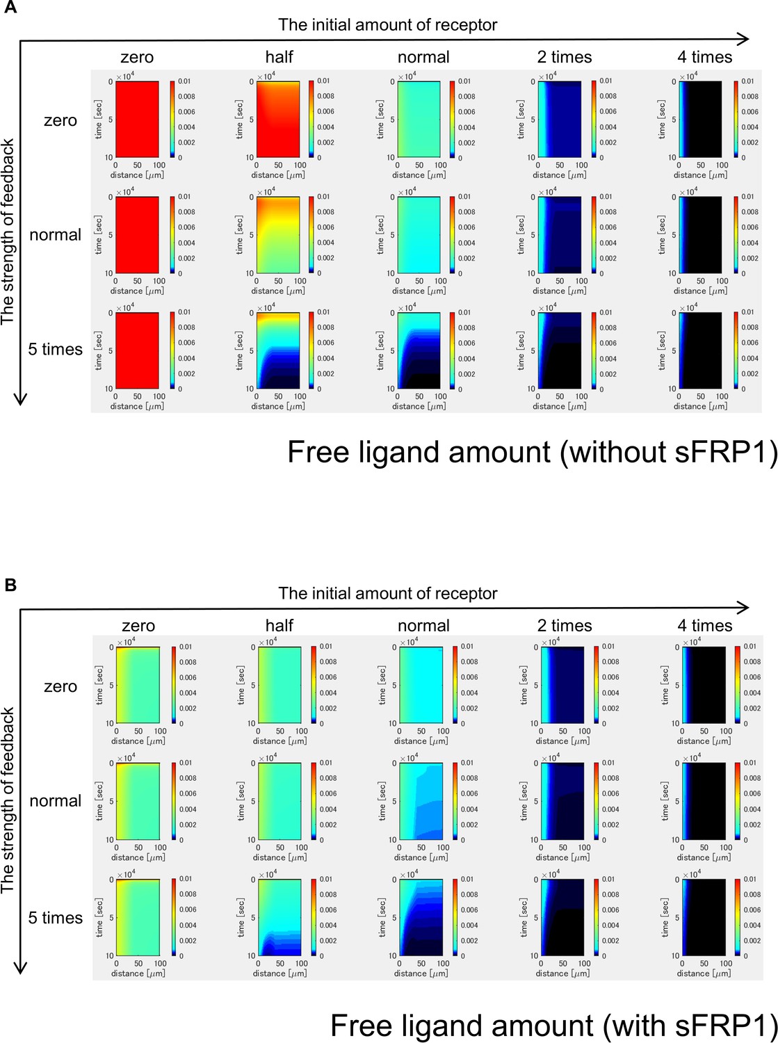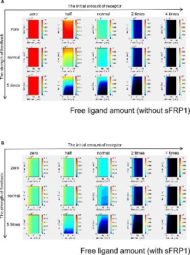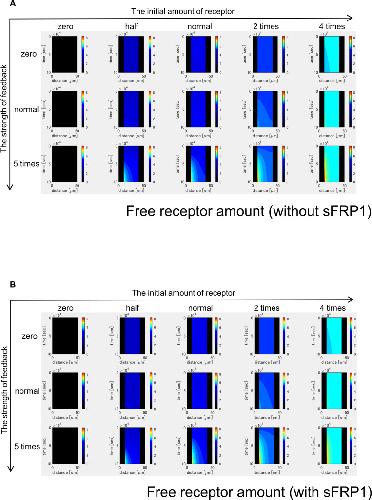 Figure 3-figure supplement 5. Time changes of free ligand amount without sFRP1 (A) or with sFRP1 (B). The amount of free ligand was higher with low initial amount of receptor and no feedback. However, with the feedback, the amount was gradually reduced. |