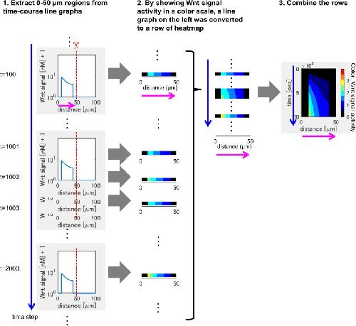Figure 3-figure supplement 3. Method of heatmap drawing. (1) We extracted 0-50 μm regions from the line chart at each time point (time proceeds from upper to bottom). (2) By showing Wnt signaling activity in a color scale, a line chart on the left was converted to a row of heatmap. (3) By combining the rows in (2), heatmap was drawn. |