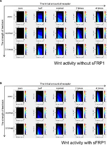 Figure 3-figure supplement 6. Time changes of free receptor amount without sFRP1 (A) or with sFRP1 (B). Changes of the amount of free receptor shows patterns similar to those of Wnt signal activity (Figure 3âfigure supplement 4). |
