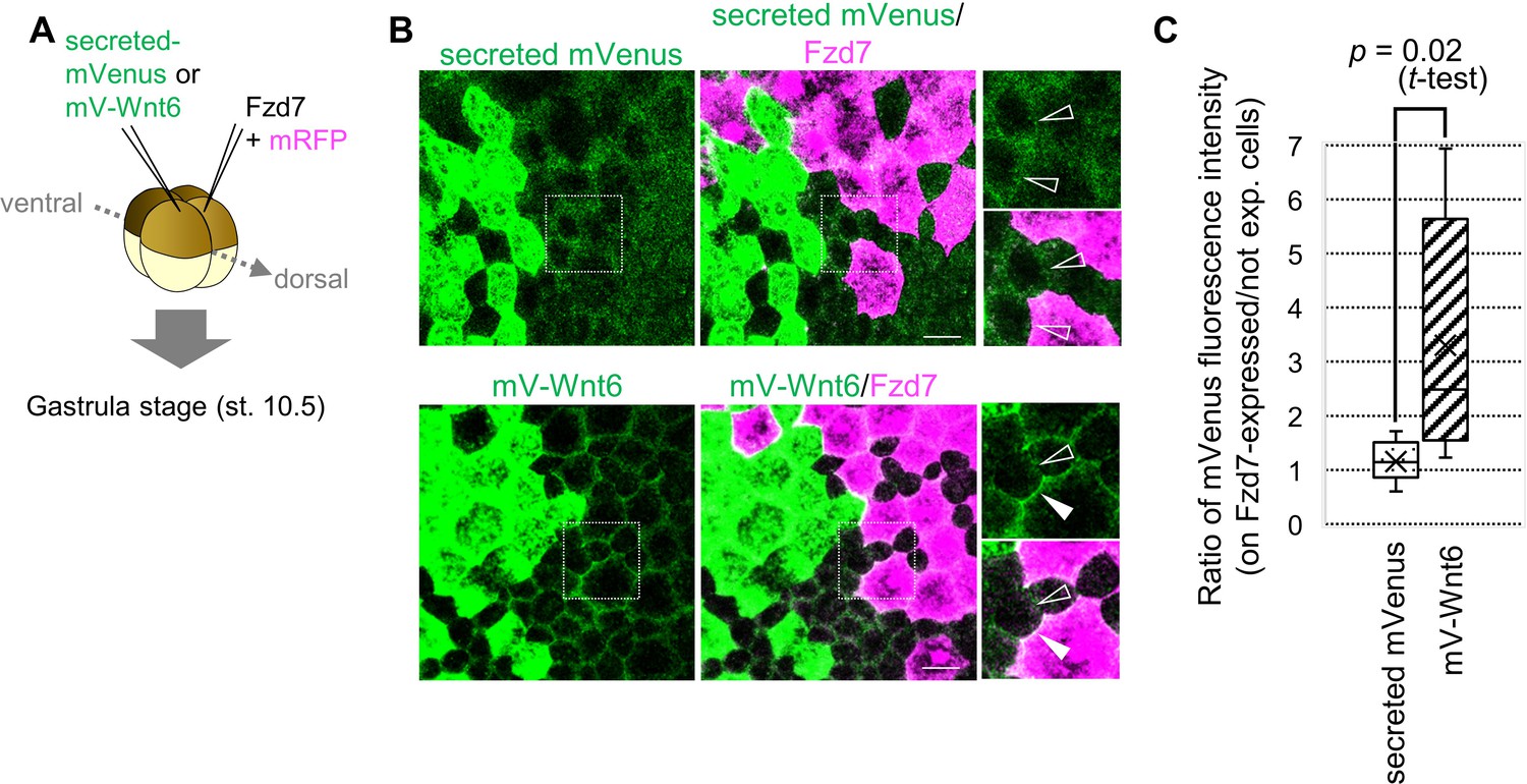 Figure 2. Wnt6 distribution is restricted by Fzd7. (A) Schematic view of the experiment. 500 pg of secreted mVenus (signal-peptide-fused mVenus) or mV-Wnt6 mRNA and Fzd7 mRNA (with mRFP) were injected into different blastomeres at the four-cell stage, and specimens were fixed at st.10.5 (gastrula stage). (B) mV-Wnt6 accumulated on Fzd7-expressing cells, whereas secreted mVenus did not (confocal image). mV-Wnt6 (green) accumulated on Fzd7-overexpressed cells (magenta cells; arrowhead), but not on intact cells (open-arrowhead). The distribution of secreted mVenus remained unchanged even when Fzd7 was overexpressed (open arrowheads). An enlarged view of the area indicated by squares on the left figure is shown on the right (the top, mVenus; the bottom, merged). Scale bar, 30 μm. (C) A box plot of the ratio of mVenus fluorescence intensity between neighboring cells (Fzd7-expressing cells / not Fzd7-overexpressed cells, n=7 pairs (secreted mVenus), 8 pairs (mV-Wnt6)). The horizontal line indicates the median. Edges of boxes indicate the first and third quartiles. The cross indicates the mean, and whiskers indicate the minimum and maximum. |