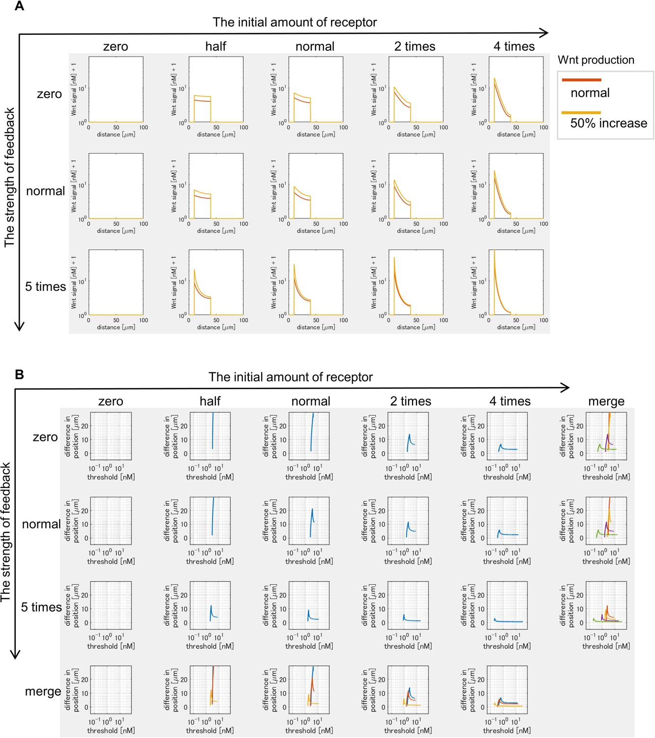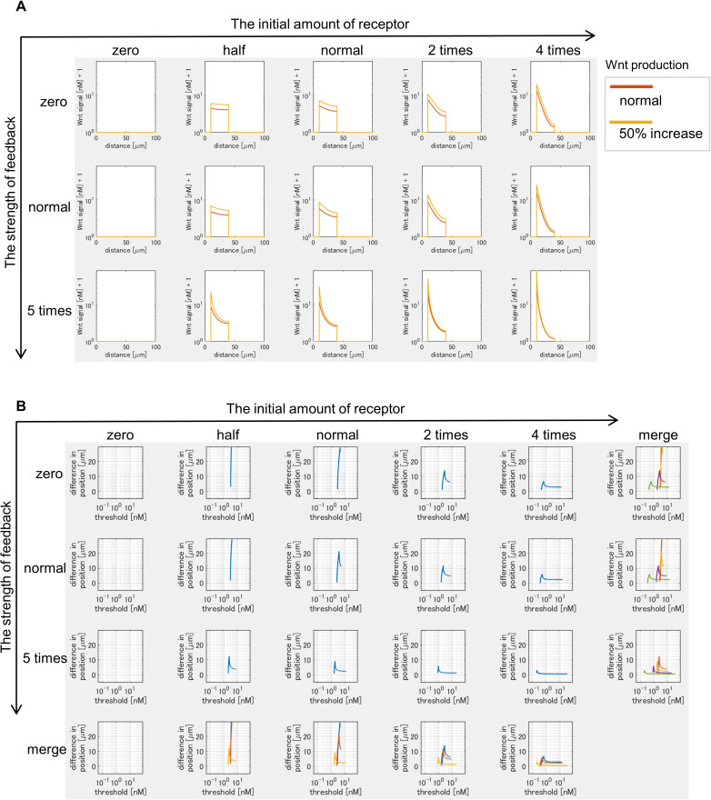 Figure 3-figure supplement 2. Changes in Wnt signaling activity due to varying Wnt production. (A) Two lines in each graph shows Wnt signaling activity with a different Wnt production rate (normal and 50% increase) at t=tmax = 105 sec (~1 day after the onset of the simulation). (B) The vertical axis in each graph shows the difference of positions of the edges of Wnt-signal-active regions when Wnt production rate is changed (normal to 50% increase). The horizontal axis indicates threshold values of Wnt signal activation. |