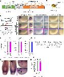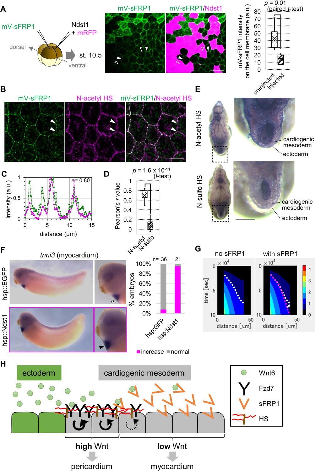 Figure 4. Contributions of sFRP1 and heparan sulfate in Xenopus heart development. (A) sFRP1 did not accumulate on ndst1-expressing cells (open arrowhead), compared to intact cells (arrowhead). Indicated mRNAs were injected into different blastomeres at the four-cell stage. ndst1 was expressed in magenta-colored cells. mVenus fluorescence intensity on cell membranes is shown in the box plot. The horizontal line indicates the median. Edges of boxes indicate the first and third quartiles. The cross indicates the mean, and whiskers indicate the minimum and maximum. Scale bar, 30 μm. (B) sFRP1 was highly localized on N-acetyl-rich HS. mV-sFRP1 mRNA was injected into one blastomere at the four-cell stage. N-acetyl-rich HS was visualized with IHC. Signal intensity is quantified in C-D. Scale bar, 20 μm. (C) A typical result of a signal intensity measurement (between the two arrowheads in B) (green, mV-sFRP1; magenta, N-acetyl-rich HS). (D) Quantification of the colocalization between sFRP1 and N-acetyl-rich HS or N-sulfo-rich HS. A box plot of Pearsonâs r value, calculated from measurements, as in C (n=10 (N-acetyl-rich HS), 11 (N-sulfo-rich HS)), The p-value from Studentâs t-test is shown. (E) The distribution of N-acetyl-rich and N-sulfo-rich HS in heart tissue. IHC for N-acetyl-rich and N-sulfo-rich HS. The dotted line in the left figure shows the position of the magnified image on the right. N-acetyl-rich HS was highly localized in the outer region of cardiogenic mesoderm (prospective pericardium). Scale bar, 0.1 mm. (F) Heat-induced expression of ndst1 expanded tnni3 expression (myocardium). hsp::Ndst1 or hsp::EGFP (Figure 4âfigure supplement 2A) was injected into the prospective heart region at the four-cell stage, and heat shock (33°C, 15 min x 3 times) was induced at st. 24. In situ hybridization against tnni3 (cardiac troponin I) was performed at st. 32 as quantified in the graph (Fisherâs exact test, p=2.8 x 10â11). Scale bar, 0.5 mm. (G) Heatmap of Wnt signaling activity with/without sFRP1. The time change is shown as kymographs, in which time advances from top to bottom. The dotted line (white, no sFRP1; magenta, with sFRP1) shows an example of the threshold in Wnt signaling activity. The line became nearly vertical faster with sFRP1 (the change of the contour by addition of sFRP1 is indicated by a white arrow). These figures correspond to parts of Figure 3âfigure supplement 4 (âthe initial amount of receptorâ = ânormalâ, âthe strength of feedbackâ = ânormalâ). (H) Schematic view of Wnt signaling in heart tissue. Wnt ligand is secreted from the epidermis (left cells). Before the onset of Wnt6 expression, the receptor (Fzd7) is broadly expressed around the prospective pericardium region. Wnt signaling is activated in a concentration-dependent manner (circular arrows), which induces Fzd7 expression and restricts Wnt ligand spreading. sFRP1 is secreted from the prospective myocardium region. This sFRP1 expression is inhibited by Wnt signaling. sFRP1 protein distribution is restricted by N-acetyl HS, which is abundant in the outer region of cardiogenic mesoderm. |