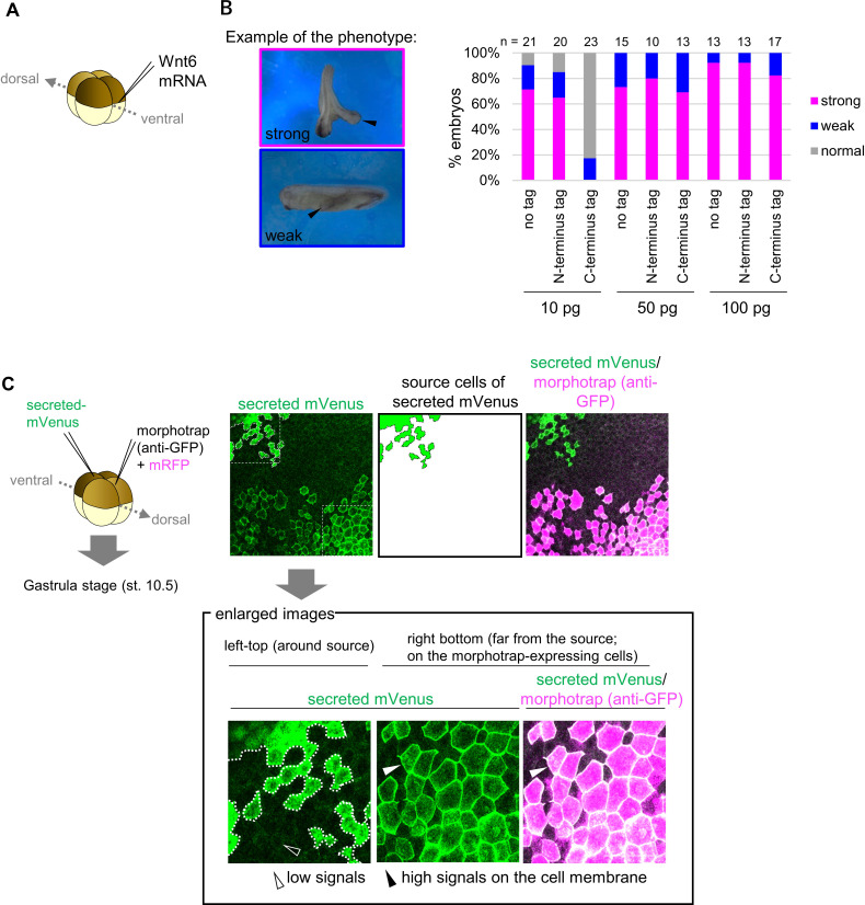 Figure 2-figure supplement 2. Biological activity of mVenus-tagged Wnt6 and confirmation of the secretion of secreted mVenus. (A) Each mRNA was injected into the marginal region of a ventral blastomere at the four-cell stage and the specimens were counted at the tailbud stage. (B) The biological activity of mVenus-tagged Wnt6 indicated by secondary axis formation with different doses of the injected mRNA (the doses and the number of the specimen were indicated in the graph). The criteria of âstrongâ or âweakâ is indicated in the left. N-terminus tagged Wnt6 showed higher activity as that of untagged Wnt6 (no tag), compared to that of C-terminus tagged one. (C) Schematic view of the experiment. 500 pg of secreted mVenus (signal-peptide-fused mVenus) and morphotrap (anti-GFP antibody) mRNA (with mRFP) were injected into different blastomeres at the four-cell stage, and the specimens were fixed at st.10.5 (gastrula stage). Fluorescence intensity of secreted mVenus was lower around the source cells but higher on the morphotrap-expressing cells (magenta colored cells; which expresses anti-GFP antibody on the cell membrane). Source cells of secreted mVenus are surrounded by dotted lines (the left panel) and illustrated in the middle panel. Enlarged views (where was indicated by squares (the left panel)) are on the bottom. Scale bar, 100 μm. |
