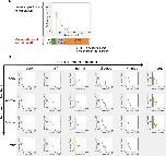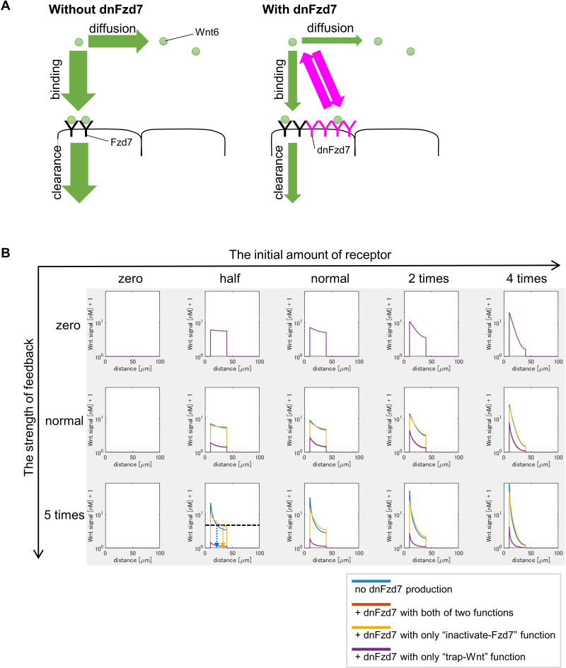 Figure 3-figure supplement 8. dnFzd7 with only âtrap-Wntâ function does not expand Wnt-signal-active region but dnFzd7 with only âinactivate-Fzd7â function does. (A) Schematic figure shows that âtrapperâ prevents Wnt from diffusing and being degraded at the same time. Circle represents Wnt6. âYâ represents receptors (black, Fzd7; magenta, âtrapperâ (dnFzd7 with only âtrap-Wntâ function)). Arrows represent events (Wnt binding to the receptor, Wnt clearance, Wnt diffusion). Magenta arrows represents the rate of Wnt binding to the trapper or Wnt dissociation from the âtrapperâ. The width of the arrows indicates the rate of these events. Without the âtrapperâ (left panel), Wnt binds to Fzd7 or diffuses. The âtrapperâ (right panel) binds to Wnt, and consequently inhibits Wnt clearance and diffusion at the same time. Thus, dnFzd7 that only has âtrap-Wntâ function does not promote Wnt diffusion. (B) dnFzd7 with only âtrap-Wntâ function greatly reduced Wnt signaling level but dnFzd7 with only âinactivate-Fzd7â function expanded the signaling range. Wnt signaling activity was shown at t=tmax = 105 s (~1 day after the onset of the simulation). The initial amount of receptor increases toward the right, and the strength of feedback increases toward the bottom. Each colored line indicates Wnt signal activity with/without dnFzd7 of various types (blue, no dnFzd7 production; orange,+dnFzd7 with both of two functions; yellow,+dnFzd7 with only âinactivate-Fzd7â function; purple,+dnFzd7 with only âtrap-Wntâ function). However, when âthe strength of feedbackâ is zero, dnFzd7 is not expressed. Thus, all lines with/without dnFzd7 showed the same results in the top panels. When âthe strength of feedbackâ was greater than zero (especially when âthe initial amount of receptorâ was smaller), dnFzd7 with only âinactivate-Fzd7â expanded the Wnt signal active region. In the panel of âthe initial amount of receptor = halfâ and âthe strength of feedback = 5 timesâ, we showed an example of threshold of Wnt signal activity to determine the edge of Wnt-signal-active region (shown by a dashed line), and the arrows show the edge of the activated region in each condition. dnFzd7 with both of the two functions does not expand the Wnt signal active region, indicating that dnFzd7 in wet experiment should have lower Wnt affinity than Fzd7. |