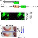 Figure 3-figure supplement 7. TCF-dnFzd7-TM accumulates Wnt6 protein but cell-autonomously inhibits Wnt signaling. (A) Schematic figure of the construct (TCF-dnFzd7-TM) inhibiting Fzd7 function in a Wnt-dependent manner. Luciferase sequence in TOPFlash plasmid was replaced with the sequence of dnFzd7, which is the extracellular domain of Fzd7, and mouse IgG transmembrane. (B) mV-Wnt6 mRNA and TCF-dnFzd7-TM plasmid (with mRFP mRNA) were injected into different blastomeres at the four-cell stage (as indicated in the left). mV-Wnt6 signal was high (arrowhead) on the cell membrane between cells with TCF-dnFzd7-TM plasmid injected (magenta), compared to that between intact cells (open arrowhead) as quantified in the graph. mVenus fluorescence intensity on the cell membrane was discretely measured on mRFP-positive cells (injected) and mRFP-negative cells (uninjected). Fluorescence intensities measured on neighboring cells were tested by paired t-test (n=5). The horizontal line indicates the median. Edges of boxes indicate the first and third quartiles. The cross indicates the mean, and whiskers indicate the minimum and maximum. These results indicate dnFzd7-TM can accumulate Wnt6 in a cell-autonomous manner. (C) Wnt6 mRNA and TCF-dnFzd7-TM plasmid (with a tracer, tetramethylrhodamine-dextran (TMR)) were injected into different blastomeres at the 16-cell stage. The hallmark of activated Wnt signaling, nuclear localization of β-catenin was reduced in the TCF-dnFzd7-TM injected cells magenta region, compared to the intact cells (non-magenta region) as quantified in the graph (Fisherâs exact test, p=2.7 x 10â9). Nuclear localizations of β-catenin are indicated by arrowheads (intact cells, white; dnFzd7-expressed cells, magenta). It should be noted that DNA injection generally induces mosaic expression, thus only some of the injected cells express dnFzd7-TM. (E) Injection of TCF-dnFzd7-TM induced gata5 expression (pericardium) and reduced tnni3 expression (myocardium) as quantified in the graph (Fisherâs exact test, p=1.4 x 10â5, 2.3 à 10â6, respectively). TCF-dnFzd7-TM was injected into two blastomere (prospective heart region) at the four-cell stage and fixed at st. 32. |