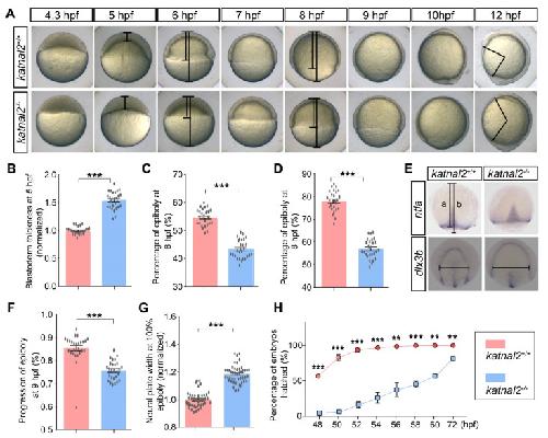Figure 2. Katnal2-/- embryos exhibited developmentally delayed phenotypes. (A) Images of the embryos in time series from the initiation until the finish of epiboly. Images are lateral views with the animal pole on the top. (B) Normalized blastoderm thickness of the katnal2+/+ and katnal2-/- embryos at 5 hpf (+/+, N = 26; -/-, N = 27). (C,D) The epiboly progression at 6 hpf and 8 hpf (N = 27 for each genotype) measured as indicated in panel (A). (E) Expression patterns of ntla in 9 hpf embryos and dlx3b in 100% epiboly embryos were analyzed by in situ hybridization. The line “a” represents the distance from the animal pole to the boundary of epiboly movement. The line “b” represents the distance between the animal and the plant pole. The horizontal line in dlx3b staining results represents the width of the neural plate. (F) katnal2-/- embryos exhibited epiboly movement delay at 9 hpf as determined by ntla staining (N = 27 for each genotype). (G) Normalized neural plate width determined by dlx3b staining at 100% epiboly stage (+/+, N = 43; -/-, N = 46). (H) Percentage of embryos hatched was recorded every 2 h from 48 hpf to 60 hpf. Data are shown as mean ± S.E.M.; ** indicates p < 0.01, and *** indicates p < 0.001.