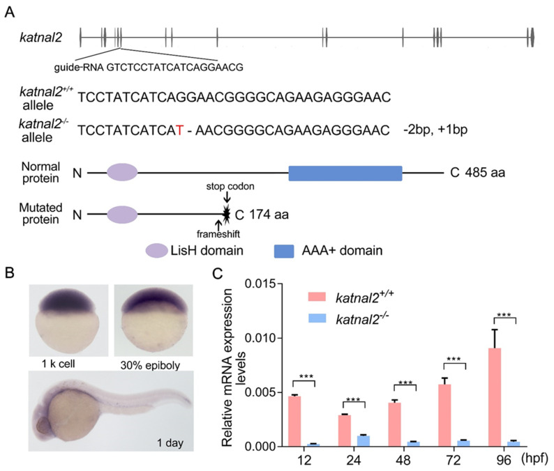 Figure 1. Generation of katnal2-/- allele by CRISPR/Cas9 gene-editing technology. (A) Structure of zebrafish katnal2 gene. The protein includes an N-terminal LisH (Lis-homology) domain and a C-terminal AAA catalytic domain. A guide-RNA was designed to target a 23 bp region in exon 6. The katnal2-/- allele contains a 2-base deletion and a 1-base insertion. The red color indicates the inserted nucleotides and the “-” indicates the deleted nucleotides. The mutation causes frameshift and early truncation of the protein prior to the AAA+ domain. (B) The expression pattern of katnal2 in the early embryonic development determined by in situ hybridization. (C) The expression level of katnal2 mRNA in katnal2+/+ (pink) and katnal2-/- (blue) alleles. Data are shown as mean ± S.E.M.; *** indicates p < 0.001.