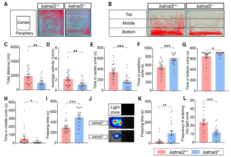 Figure 5. Adult katnal2-/- zebrafish displayed reduced locomotion activity and anxiety-like behaviors. (A) Schematic diagram of the open-field test and representative trajectory diagrams (N = 24 for each genotype). (B) Schematic diagram of the novel tank test and representative trajectory diagrams (N = 24 for each genotype). (C) The total distance moved in the open field test. (D) The average velocity in the open field test. (E) Duration time in the center zone. (F) Duration time in the peripheral zone. (G) Duration time in the bottom zone in the novel tank test. (H) Duration time in the middle zone in the novel tank test. (I) The freezing time in the novel tank test. (J) Schematic diagram of the light-and-dark test and heat map of sojourn time (N = 21 for each genotype). (K) The freezing time in the light zone. (L) The frequency of the tester zebrafish entering the light zone. Data are shown as mean ± S.E.M.; * indicates p < 0.05, ** indicates p < 0.01, and *** indicates p < 0.001.