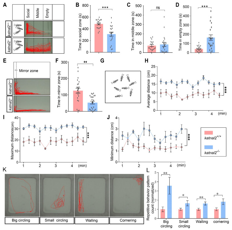 Figure 6. Katnal2-/- zebrafish showed impaired social interaction and reduced social cohesion. (A) Schematic diagram of the three-tank social interaction test and representative trajectory diagrams (N = 20 for each genotype). (B) Duration time in the social zone. (C) Duration time in the middle zone. (D) Duration time in the empty zone. (E) Schematic diagram of the mirror test and representative trajectory diagrams (+/+, N = 22; -/-, N = 23). (F) Duration time in the mirror zone. (G) Schematic diagram of the shoaling test (N = 9 for each genotype). (H) The average inter-fish distance was recorded and calculated every 20 s. (I) The maximum inter-fish distance was recorded and calculated every 20 s. (J) The minimum inter-fish distance was recorded and calculated every 20 s. (K) Representative trace of big circling, small circling, and walling. (L) Comparison of the frequency of different repetitive behaviors between katnal2 mutants and controls (N = 45 for each phenotype). Data are shown as mean ± S.E.M.; * indicates p < 0.05, ** indicates p < 0.01, and *** indicates p < 0.001 and ns indicates no significance.