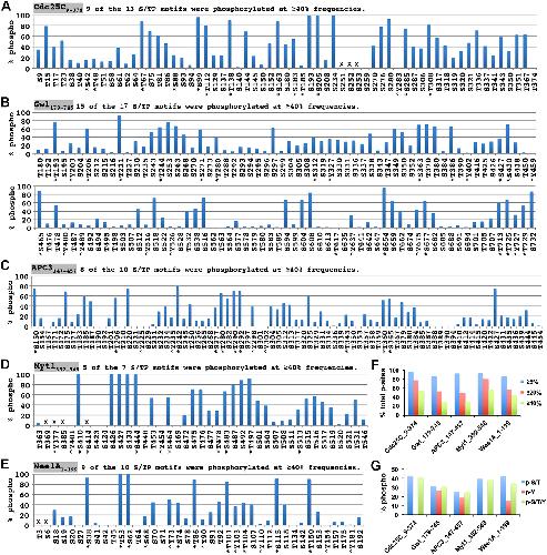FIGURE 5: Widespread medium to high phosphorylation stoichiometries in the supershift domain. (A–E) Phosphorylation identification frequencies for individual S/T/Y residues in Cdc25C9-374 (A), Gwl179-745 (B), APC3147-457 (C), Myt1352-548 (D), and Wee1A1-199 (E). Asterisks indicate proline-directed S/T residues, and < symbols indicate tyrosine residues. Crosses indicate the S/T/Y residues in nonrecovered regions. (F) Percentages of the phosphorylation sites that were identified at ≥5%, ≥20%, and ≥40% frequencies by mass spectrometry for the five supershift fragments. (G) Percentages of total S/T, Y, or S/T/Y residues recovered from each of the five supershift fragments that were phosphorylated. |