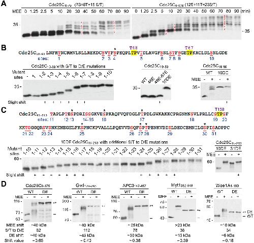 FIGURE 7: Generation of supershifts by additive numerous small shifts. (A) Phosphorylation of myc-tagged Cdc25C9-79 (left) and Cdc25C9-129 (right) for the indicated minutes, followed by myc-tag immunoblotting. Red numbers indicate discernible steps in the process of developing the supershift. (B) The upper panel shows the amino acid sequence of Cdc25C19-80 with numbering of the 12 S/T residues (red underlined), with conserved TP motifs at T48 and T67 highlighted by yellow, and the additional proline-directed S/T residue is indicated by an asterisk. The lower panel shows myc-tag immunoblots of different mutant forms of Cdc25C19-80 without MEE treatment (left and middle) or with MEE treatment (right). (C) The upper panel shows the amino acid sequence of Cdc25C81-213 with numbering of the 22 S/T residues, with the conserved TP motifs at T138 highlighted by yellow and the remaining six proline-directed S/T residues indicated each by an asterisk. The lower panel shows myc-tag immunoblots of different mutant forms of 10DE Cdc25C19-213 without MEE treatment (left) or with MEE treatment (right). (D) Phosphorylation of myc-tagged wild type (WT) or all ST-to-DE mutant forms (DE) of the five supershift fragments with MEE for 2 h, followed by myc-tag immunoblotting. The shift value was calculated by dividing the shift kDa from all DE mutations by the total number of DE mutations. |