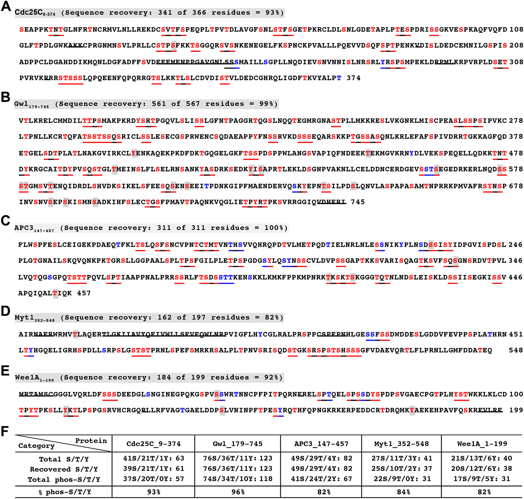 FIGURE 4: Significant phosphorylation of most of the S/T or S/T/Y residues in the supershift domain. (AâE) Phosphorylation sites identified in the supershift fragments of Cdc25C (A), Gwl (B), APC3 (C), Myt1 (D), and Wee1A (E). Strikethroughs indicate nonrecovered sequences. Red and blue types indicate phosphorylated and nonphosphorylated S/T/Y residues determined by mass spectrometry, respectively. Underlines are S/T/Y clusters. Shaded S/T/Y residues in red types indicate <5% of phosphorylation identification frequencies. (F) A summary of recovered S/T/Y residues and identified phosphorylation sites from the five supershift fragments. |