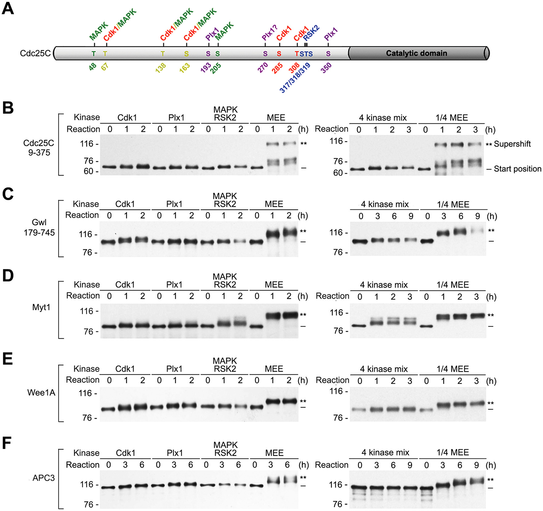 FIGURE 8: Phosphorylation of the five mitotic regulators with the four major mitotic kinases produced by TNT is insufficient to produce the M-phase supershift. (A) A schematic diagram of Cdc25C with illustration of the major Cdk1, MAPK, Plx1, and RSK2 phosphorylation sites identified in the supershift domain. (BâF) Myc tagged Cdc25C9-375 (B), Gwl179-745 (C), Myt1 (D), Wee1A (E), and APC3 (F) were each phosphorylated either with the four major mitotic kinases individually in parallel with MEE (left panels) or with the four kinases collectively (4 kinase mix) in parallel with 1:4 MEE (right panels) for the indicated hours, followed by myc-tag immunoblotting. |