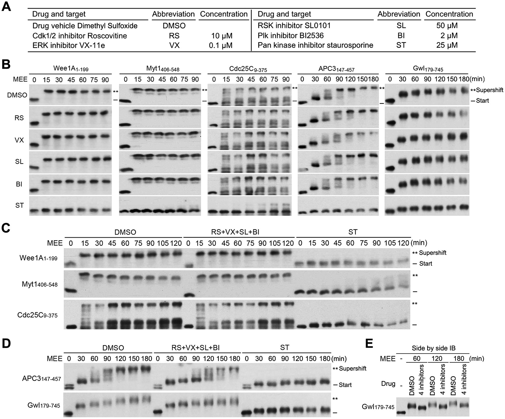 FIGURE 10: Inhibition of the four major mitotic kinase activities had little effect on MEE-induced supershifts of the five supershift fragments. (A) Kinase inhibitors and their concentrations used in MEE. (B) Phosphorylation of indicated supershift fragments with MEE in the presence of individual kinase inhibitors for the indicated minutes, followed by myc-tag immunoblotting. (C, D) Phosphorylation of indicated supershift fragments with MEE in the presence of all four of specific kinase inhibitors or ST for the indicated minutes, followed by myc-tag immunoblotting. (E) Side-by-side myc-tag immunoblotting of the Gwl179-745 samples from three different time points in D. |