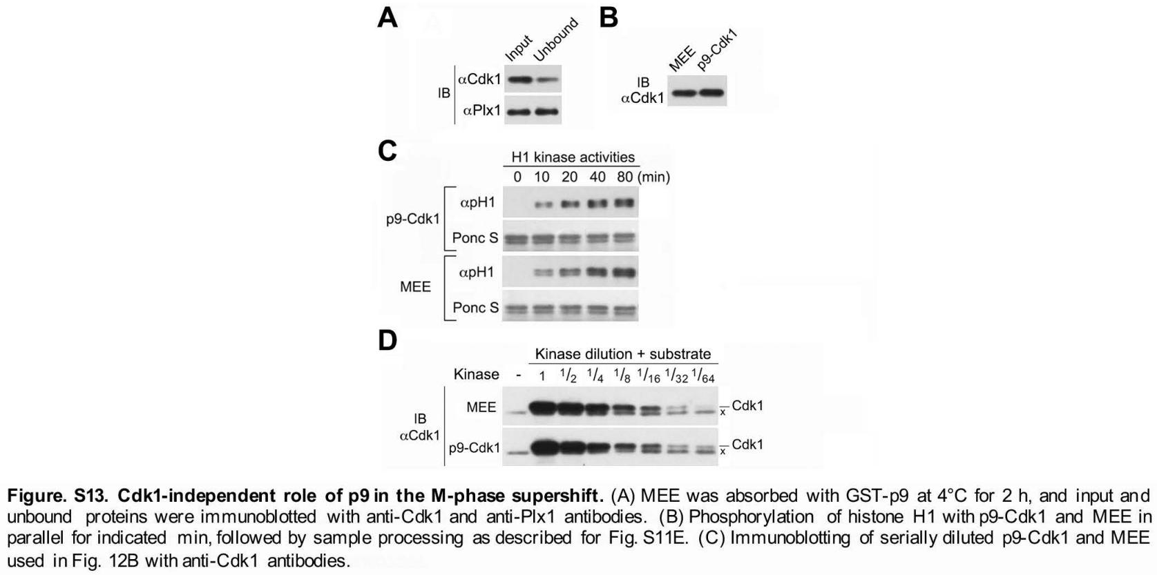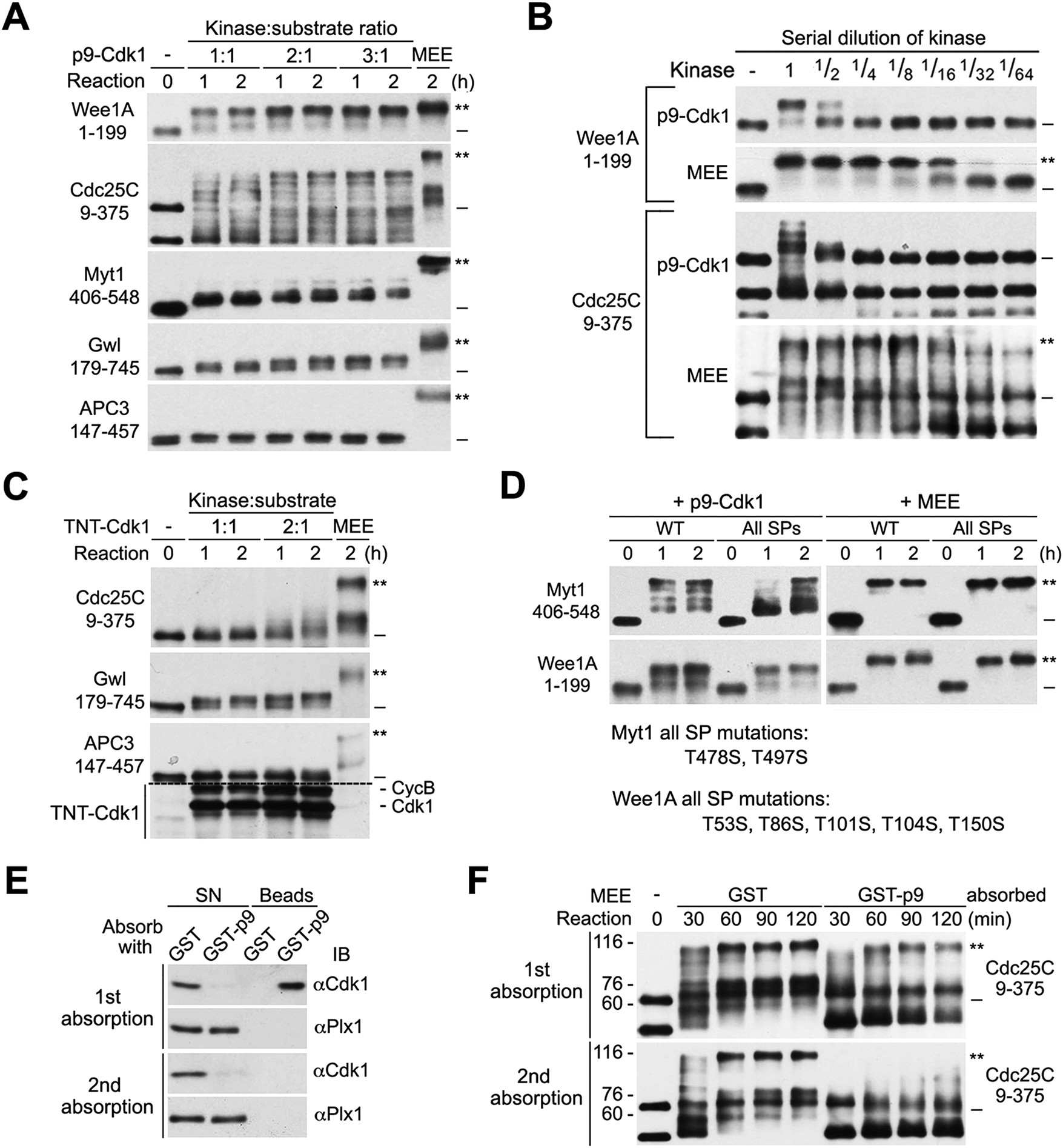 FIGURE 12: p9-enhanced multisite phosphorylation by the Cdk1/CycB complex does not play a physiologically important role in the M-phase supershift. (A) Phosphorylation of myc-tagged five supershift fragments with increased ratios of p9-Cdk1:substrate or MEE for the indicated hours, followed by myc-tag immunoblotting. (B) Parallel phosphorylation of myc-tagged Cdc25C9-375 or Wee1A1-199 with serial dilutions of p9-Cdk1 or MEE for 1 h, followed by myc-tag immunoblotting. (C) Parallel phosphorylation of each of the indicated myc-tagged supershift fragments with increased ratios of TNT-Cdk1:substrate or MEE for the indicated hours, followed by myc-tag immunoblotting. (D) Parallel phosphorylation of WT and all SP mutant form (All SPs) of myc-tagged Myt1406-548 or Wee1A1-199 with p9-Cdk1 or MEE for the indicated hours, followed by myc-tag immunoblotting. The mutant sites in the two proteins are specified. (E) MEE was absorbed with GST or GST-p9 once or twice, and the SN and bound proteins (beads) were immunoblotted with anti-Cdk1 or anti-Plx1 antibodies. (F) Phosphorylation of myc-Cdc25C9-375 for the indicated minutes with MEE that was absorbed with GST- or GST-p9 once or twice, followed by myc-tag immunoblotting. |