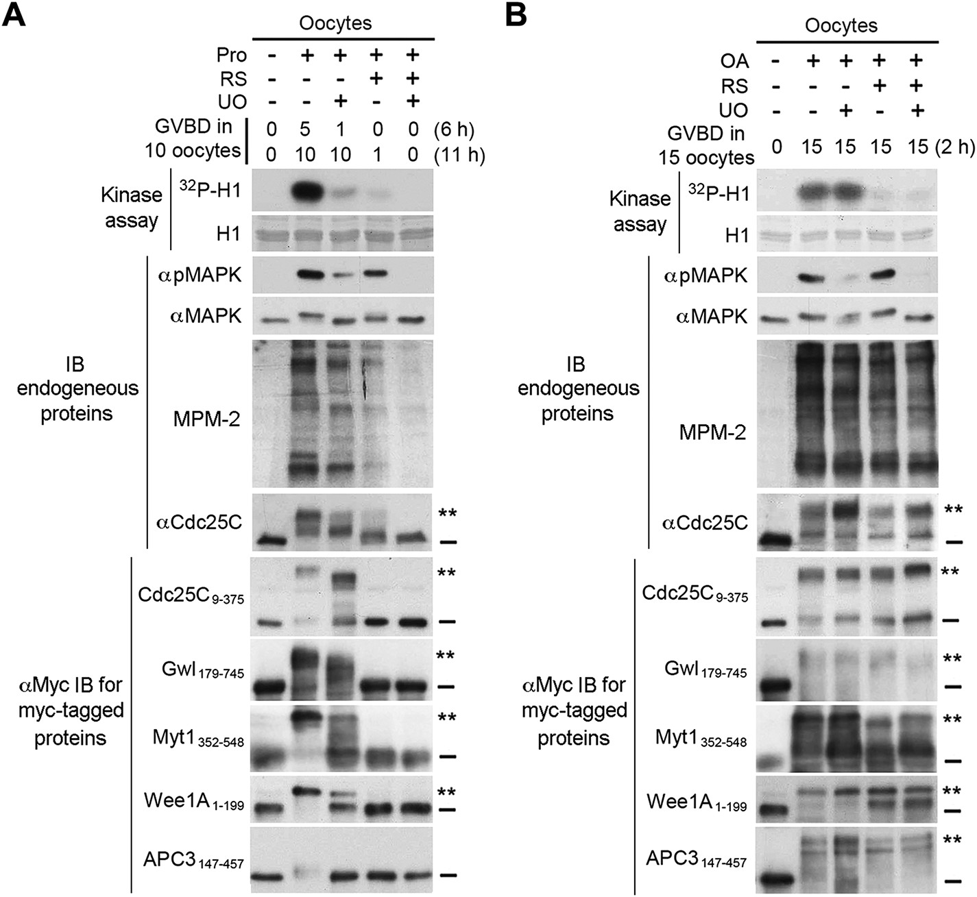FIGURE 13: The four major mitotic kinases are not required for the M-phase supershift in OA-induced Xenopus oocyte maturation. (A) Xenopus oocytes were injected with mRNA for each of the five myc-tagged supershift fragments and cultured for 6â8 h. These injected oocytes were further cultured in the presence of indicated kinase inhibitors for 2â4 h and then either stimulated with progesterone (Prog) (A) or injected with OA (B) in the continued presence of the kinase inhibitors. GVBD was scored at the indicated h. Proteins extracts of lastly collected oocytes were assayed for H1 kinase activity by 32P incorporation and immunoblotted with indicated antibodies. |