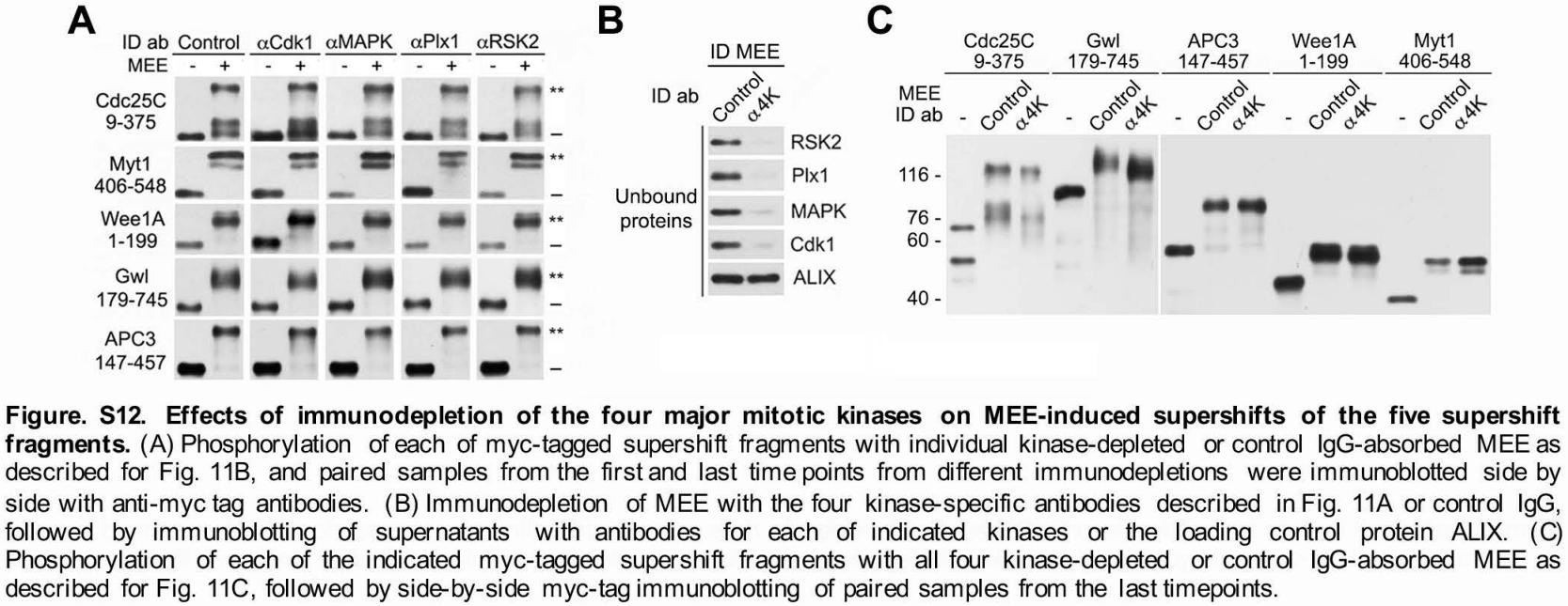 FIGURE 11: Immunodepletion of the four major mitotic kinases had no or minor effects on MEE-induced supershifts of the five supershift fragments. (A) Immunodepletion of MEE with each of indicated kinase-specific antibodies or control IgG, followed by immunoblotting of SNs with antibodies for each of indicated proteins. (B) Phosphorylation of each of myc-tagged supershift fragments with individual kinase-depleted or control IgG-absorbed MEE for the indicated minutes, followed by myc-tag immunoblotting. (C) Phosphorylation of each of myc-tagged supershift fragments with all four kinase-depleted or control IgG-absorbed MEE for the indicated minutes, followed by myc-tag immunoblotting. |