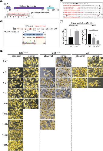 Fig. 1. Establishment of the Xenopus tropicalis tp53 Δ7 mutant line. (A) gRNA design. TAD, transactivation domain; TD, tetramerization domain. (B) Sanger DNA sequencing data show mutations induced by targeting X. tropicalis tp53. The wild‐type (wt) sequence is shown at the top with the target site in red. Red dashes indicate deletions and lowercase letters indicate insertions. (C) The tp53 Δ7 genotype in the F1 offspring. E, exon. Seven out of 29 F1 adults showed this Δ7‐heterozygous genotype. (D) Histograms of statistical data (mean values ± SD) from three independent X‐ray irradiation (14 Gy) experiments show distribution of abnormal and dead embryos among three genotypes. WT, wild‐type. graphpad prism 9 (GraphPad Software, San Diego, CA, USA) was used for the t‐test (***P < 0.001, ****P < 0.0001). (E) Representative images from one experiment show that P53‐dependent radiosensitivity in WT X. tropicalis embryos was proportionally decreased in tp53