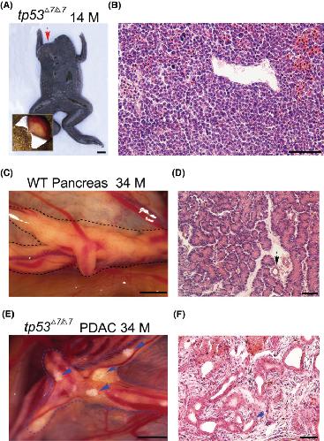 frog shows the location of the sarcoma (red dashed arrow). Dissection of the overlying skin revealed that the sarcoma grew from the hypodermis (bottom‐left corner). Scale bar, 5 mm. (B) Representative H&E staining of the sarcoma sections revealed histopathologic characteristics resembling human round cell sarcoma [38]. Similar structure was observed in all 50 serial sections. Scale bar, 50 μm. (C) Representative morphology of a dissected fresh pancreas from a 34‐month‐old wild‐type Xenopus tropicalis frog. Two frogs were dissected and similar pancreas morphology was observed. (D) Representative histology of the pancreas shown in C. Dashed arrow points to a normal pancreatic duct. Similar structure was observed in all 50 serial sections. (E) Morphology of a dissected pancreas from a 34‐month‐old tp53