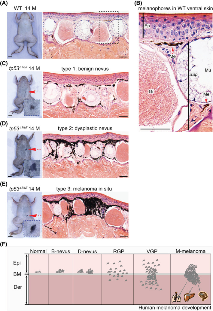 frogs with benign nevus, dysplastic nevus, and melanoma in situ, respectively; (F) ventral skin sample from a 25‐month‐old tp53