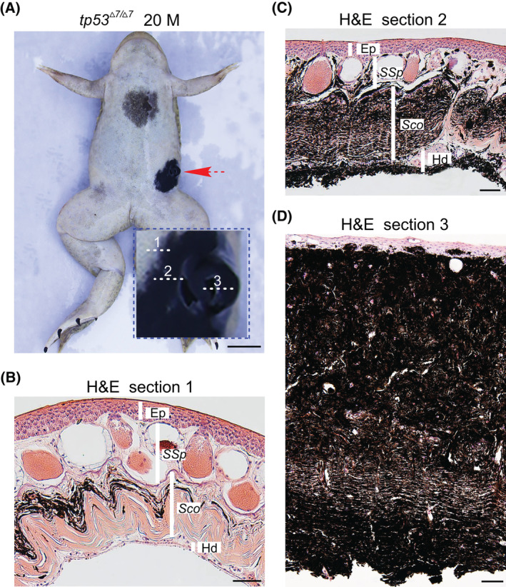 frog shows an invasive melanoma (red dashed arrow and the higher magnification view in the blue dashed box). Scale bar, 5 mm. (B–D) H&E staining of representative sections from the area, as indicated by the dashed lines 1, 2, and 3 in A, respectively. For areas indicated by each line, similar structures were observed in at least 10 neighboring serial sections. Ep, epidermis; M, months; Hd, hypodermis; Sco, stratum corneum; SSp, stratum spongiosum. Scale bars, 50 μm. |