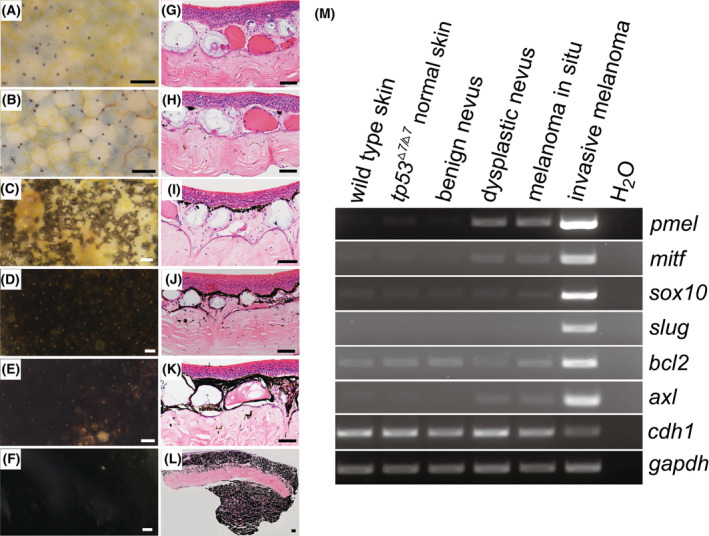frog with an invasive melanoma. Scale bars, 100 μm. (G–L) Representative histological structures (H&E staining) of samples shown in A–F, respectively. Similar structures were observed in 10 serial sections from each sample. Scale bars, 50 μm. (M) RT‐PCR analyses revealed the transcriptional expression levels of genes indicated on the right side in different samples listed on the top. gapdh was used as an RNA loading control. Identical results were obtained in two independent RT‐PCR experiments. |