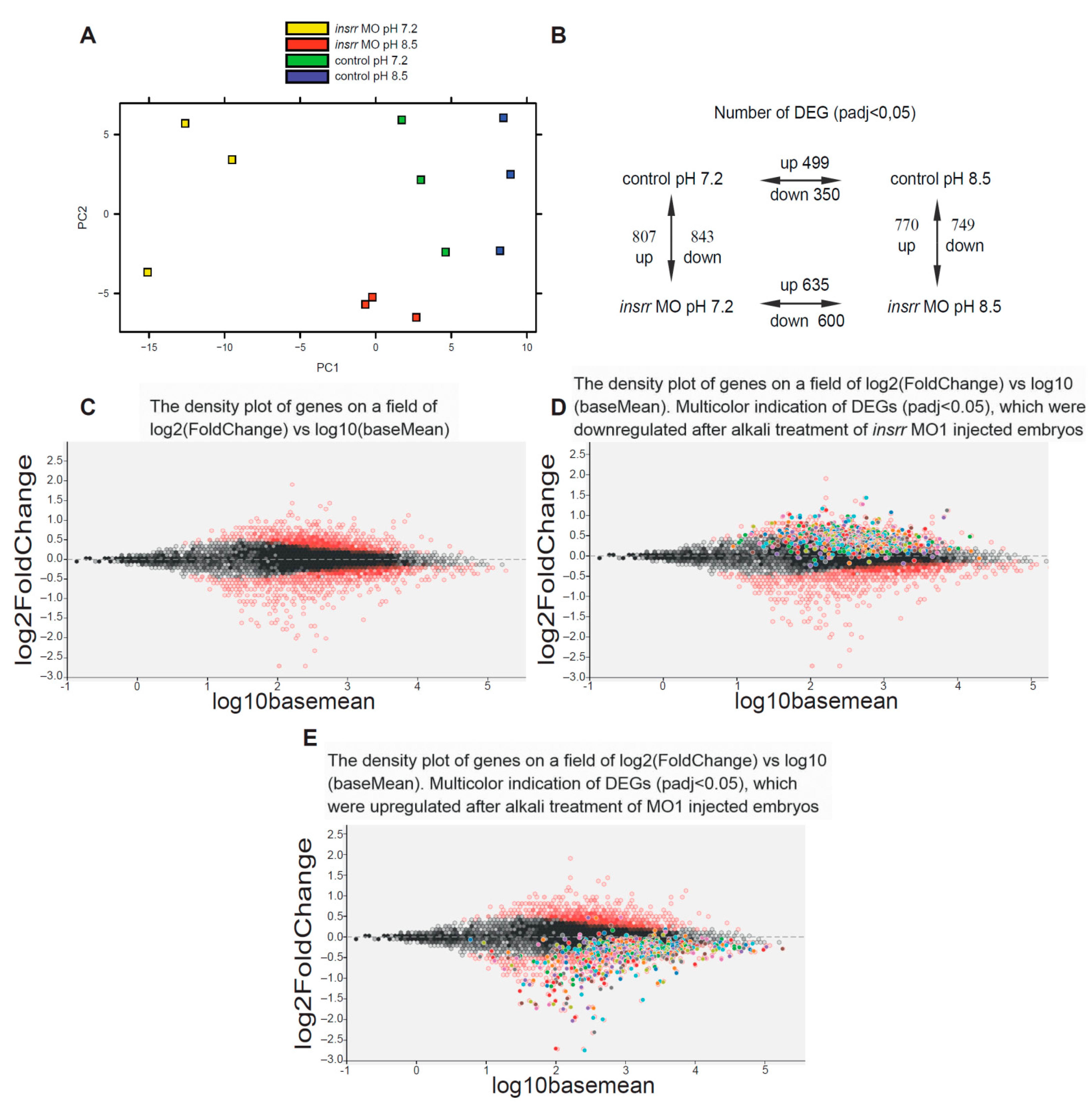 Figure 2. (A). PCA analysis of RNA-seq data of control embryos and insrr MO1 knockdown embryos after incubation in pH 7.2 or 8.5 media. (B). Representation of upregulated and downregulated DEGs (padj < 0.05) of control embryos and insrr MO1 knockdown embryos after incubation in pH 7.2 or 8.5 media. (C). The density plot of genes on a field of log2(FoldChange) vs. log10(baseMean) was plotted after differential expression analysis of transcriptomes between control and insrr MO1 knockdown embryos. DEGs with padj < 0.05 are colored in red and other genes are colored in grey. (D). Same plot with multicolor indication of DEGs (padj < 0.05) which were downregulated after alkali treatment of insrr MO1-injected embryos. (E). Same plot with multicolor indication of DEGs (padj < 0.05), which were upregulated after alkali treatment of insrr MO1-injected embryos.
