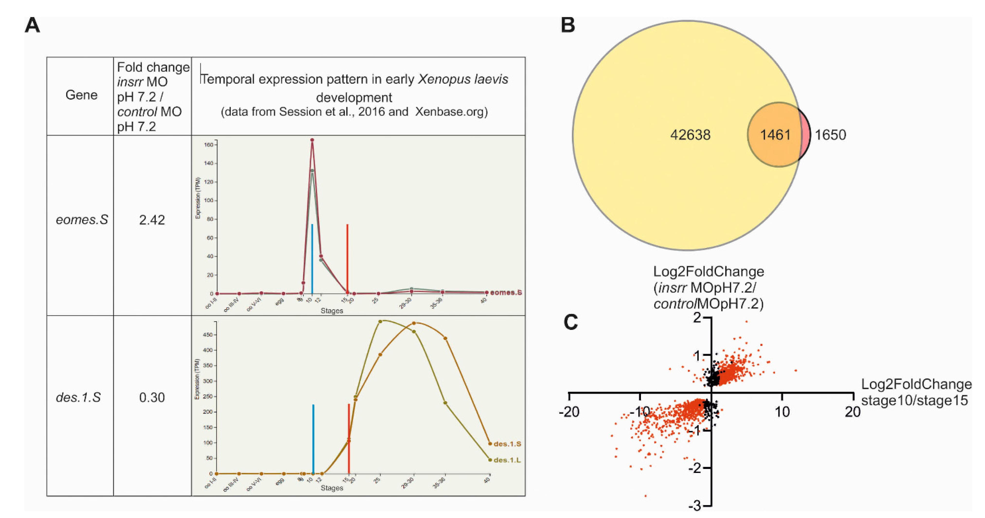 Figure 3. (A). Example of the temporal expression profiles of eomes.S and des.1.S genes. Data from [19] and Xenbase.org. (B). The intersection of expressed genes from previously published Xenopus laevis stage gene expression analysis at 10 and 15 stages and DEGs between transcriptomes of the control and insrr MO1-injected embryos at pH 7.2. (C). Graphical plot log2 (Fold change insrr MO 7.2/control MO 7.2) vs. plotted log2 (FoldChange stage10/stage15) for each 1465 DEGs. Red color indicated only DEGs between stage 10 and stage 15.