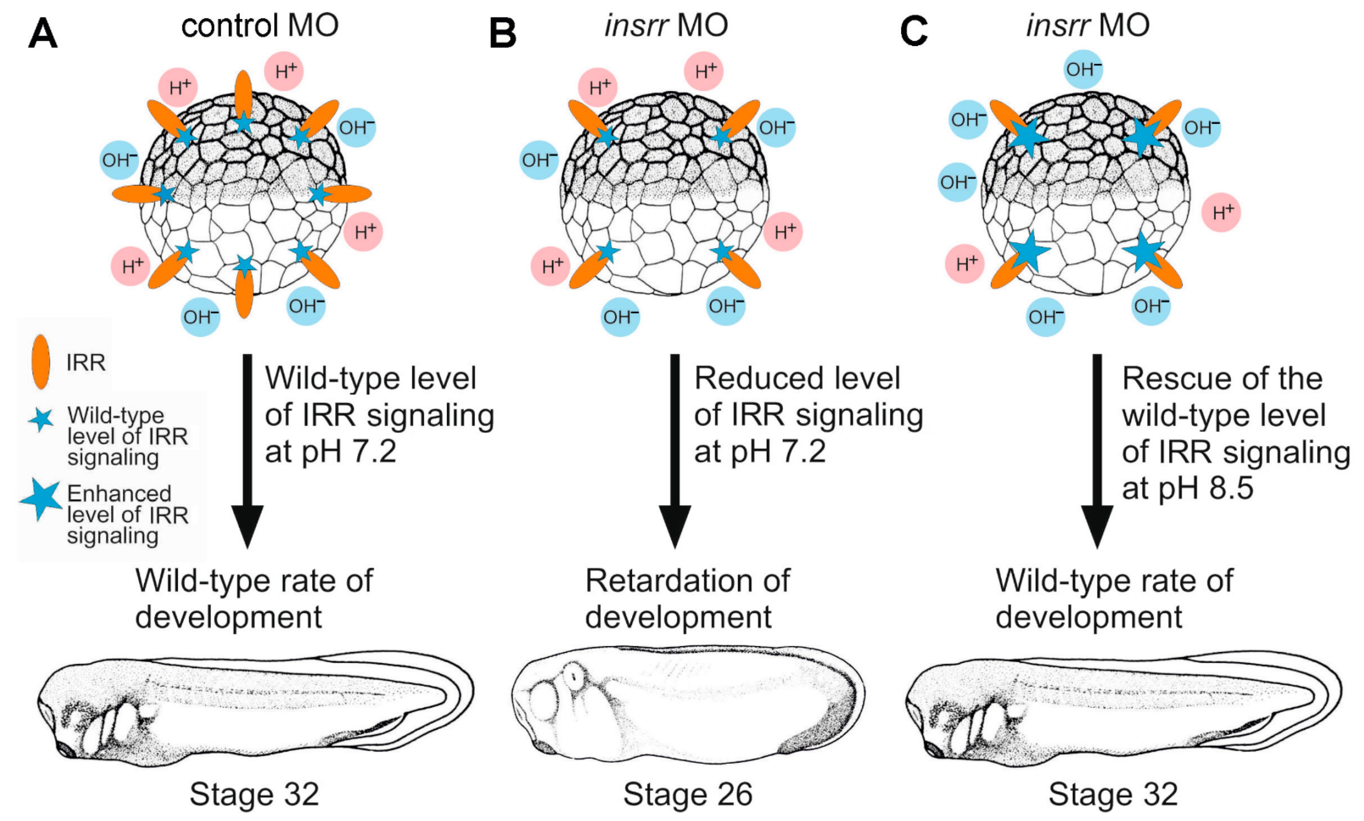 Figure 4. A model of the regulation of embryonic development by IRR. (A). In embryos injected with the control MO and at the neutral pH (7.2), the level of IRR signaling is enough to ensure the wild-type rate of embryonic development. (B). If insrr is downregulated by injection of insrr MO, the concentration of IRR molecules significantly but not completely decreases. As a result, at neutral pH (7.2) a decreased level of IRR signaling leads to the retardation of development. (C). At alkaline pH (8.5), despite the concentration of IRR molecules being significantly decreased in embryos injected with insrr MO, the level of the IRR signaling enhances, which ensures the wild-type rate of embryonic development.