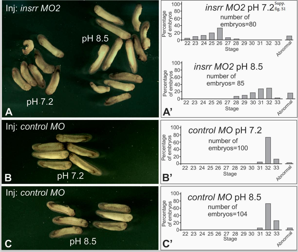 Figure 1. Downregulation of insrr by anti-sense morpholino injection retards the Xenopus laevis embryosâ development, whereas alkaline pH prevents this effect. (A). Embryos after injection of insrr MO1 at pH 7.2. (B). Embryos after injection of control MO at pH 7.2. (C). Embryos after injection of insrr MO1 at pH 8.5. (D). Embryos after injection of control MO at pH 8.5. The diagrams on (AââDâ) demonstrate the percentage distribution of embryos, some of which are shown on (AââDâ), by stage of development. As one may see, knockdown of insrr by insrr MO1 significantly retards the developmental rate of embryos comparing to their control siblings, and also distribution of the knocked-out embryos developed at pH 8.5 is significantly shifted towards the distribution seen in the wild-type siblings developed at pH 7.2 and pH 8.5.