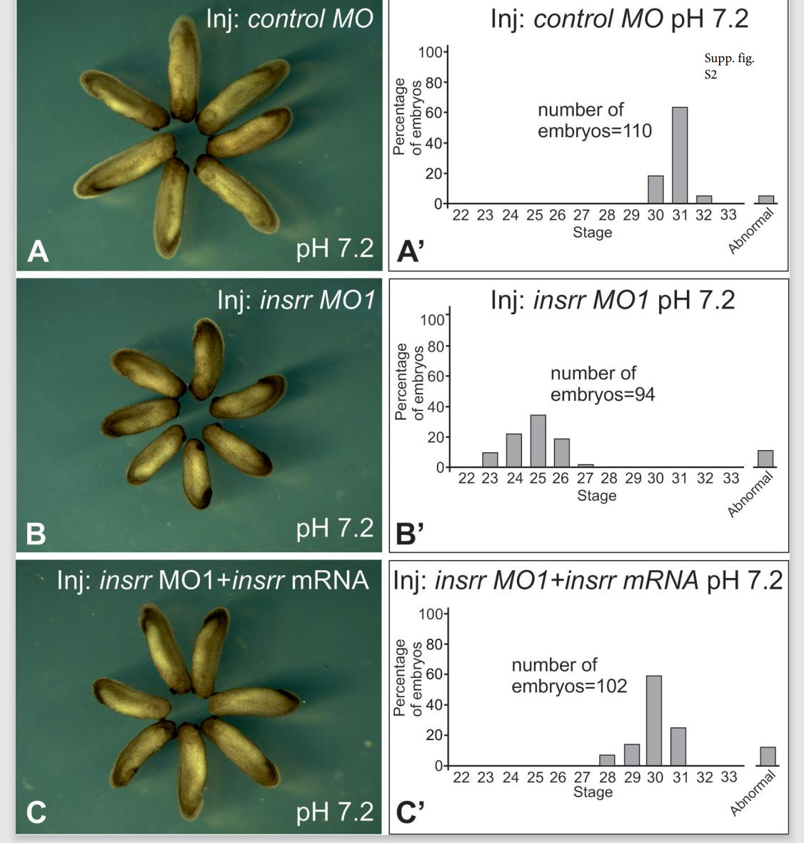 Supplement Figure S2. Rescue of insrr MO1 effect by the co-injected insrr mRNA. A-C. Embryos injected with control MO (A), insrr MO1 (B), and the mixture of insrr MO1 and insrr mRNA (C) at pH 7.2.
