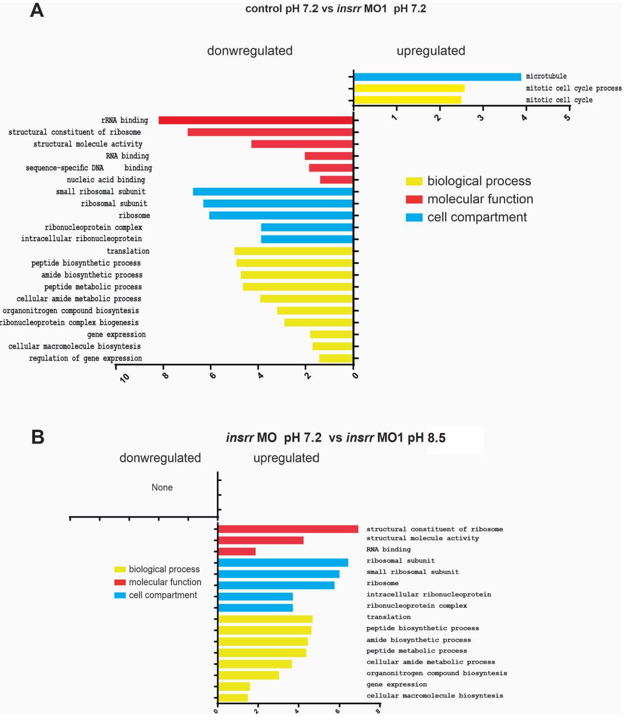 embryos at pH 8.5 and pH 7.2 (blue color). X axis indicates number of gene and genes were sorted by increasing of the FoldChange between transcriptomes of insrr MO injected embryos at pH 8.5