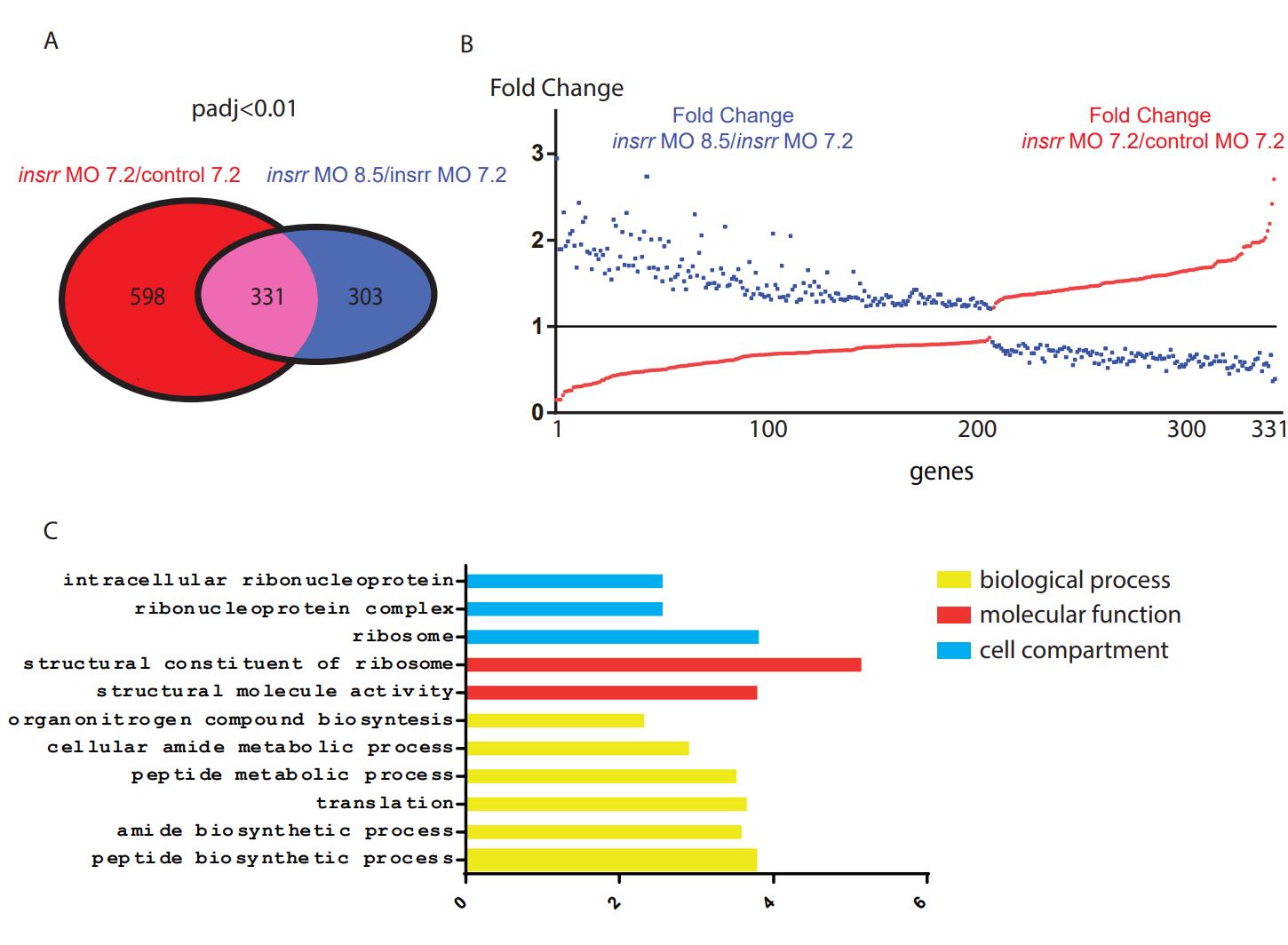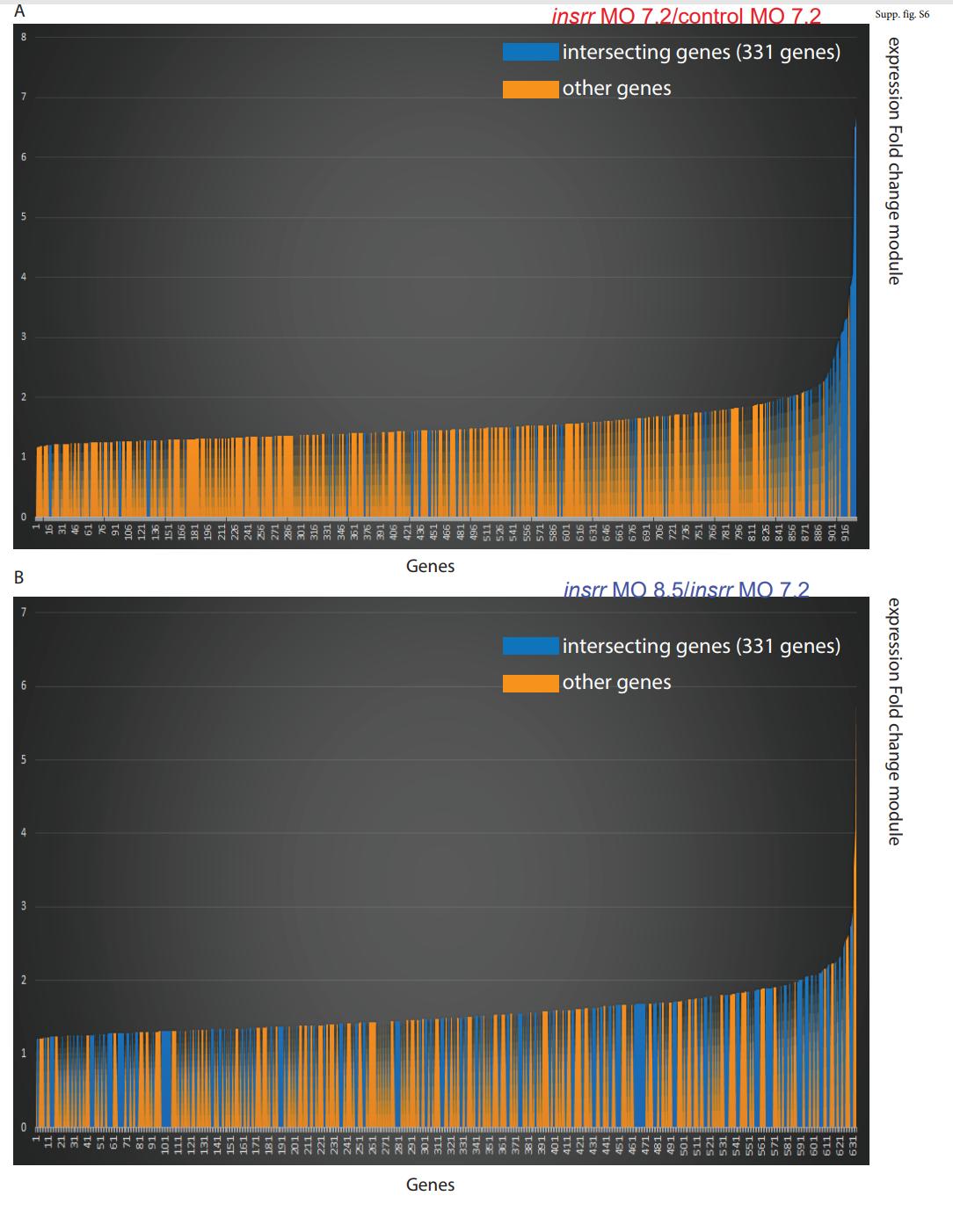 Supplement Figure S5. A. The intersection of DEGs (929 DEGs, padj<0.01) between transcriptomes of insrr MO and control MO injected embryos at pH 7.2, and DEGs (634 DEGs, padj<0.01) between transcriptomes of insrr MO injected embryos at pH 8.5 and pH 7.2. B. Analysis of the fold changes of DEGs intersection between trancriptomes of insrr MO and control MO injected embryos at pH 7.2 (red color) and between transcriptomes of insrr MOinjected