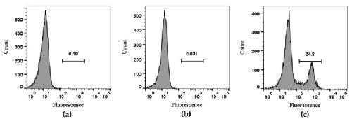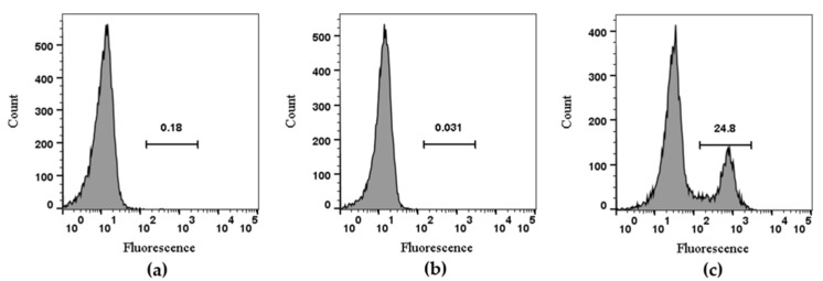 Figure 5. Flow cytometry analysis of TxID-F on RAW264.7 cells. Control RAW264.7 cells alone are compared using flow cytometry to the cells with TxID and TxID-F (RAW264.7 cell: (a), TxID: (b), TxID-F: (c). Histograms indicate live cell populations (n = 4).