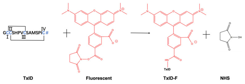 Figure 1. Conjugation reaction between 5-TAMRA SE and α-CTx TxID. The site coupling with 5-TAMRA SE is located at the N-terminus of α- CTx TxID. TxID contains two disulfide bridges between cysteine residues, and the N-terminal contains a free amino acid residue. # = C-terminal carboxamide. I, II, III and IV represent the positions of cysteine, respectively.