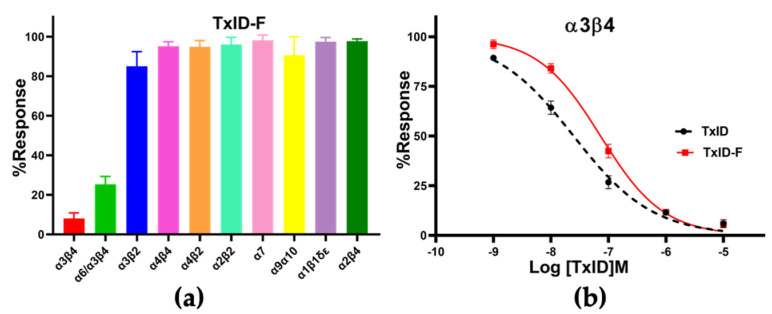 Figure 4. Pharmacological activity of TxID−F. (a) Inhibitory activity of TxID−F (10 μM) against other nAChR subtypes. (b) Concentration−response analysis of TxID and TxID−F potency against α3β4 nAChR subtype. The current was induced by 100 μM ACh. The IC50 value of TxID−F showed a 3−fold decrease, compared with WT TxID. All IC50 values and hill slopes were shown in Table 1. Error bars mean ± SEM. One−way ANOVA was used for comparison between different groups. All data were obtained from 3–6 separate oocytes for each experimental determination. All receptors were of rat origin, except α1β1δε, which was of mouse origin.