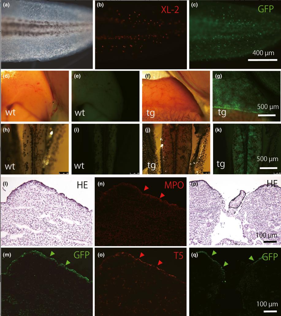 Figure 2. GFP expression in the transgenic tadpoles carrying the mpo enhancer sequence. (a–c) Whole-mount immunostaining of a transgenic embryo shows that the epidermal macrophages in the tail fin express GFP. Embryos were fixed at St. 40 and stained with XL-2 (b) or anti-GFP (c) antibody, indicating the coincidence of scattered signals. A bright-field image is also shown (a). (d–k) Anatomical views of the liver (d–g) and mesonephros (h–k) of a wild-type (d, e, h, and i) and a transgenic (tg) (f, g, j, and k) tadpole at St. 57 are shown. These hemopoietic organs and the spleen (data not shown) express GFP at a high level. (l–q) Frozen sections of the tg liver (l–o) and the mesonephros (p and q) of a St. 56 tadpole were stained with anti-GFP (m and q), the MPO antibody (n), or the T5 antibody (o). (l) and (p) are the same sections as (m) and (q), respectively, which were counterstained with HE. (l–o) Cross-section of the left lobe of the liver. (p and q) Cross-section of the mesonephros. Arrowheads in (m–o) and (q) show the positive staining at the cortex of the mesonephros and liver.