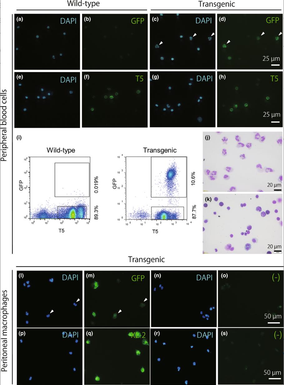 Figure 3. Myeloid cell-specific expression of GFP in transgenic frogs possessing the mpo enhancer sequence. (a–h) Smear samples of the peripheral blood cells from a wild-type frog (a, b, e, f) or a transgenic frog (c, d, g, h) were stained with anti-GFP antibody (b, d) or the T5 antibody (f, h). The same slides were counterstained with DAPI (a, c, e, g). (i–k) Flow cytometric analysis was performed as described in the Materials and Methods section. The histogram of a cell-sorting experiment shows that 10.6% of the red blood cell-depleted leukocyte fraction was GFP-positive (i), and the cytospin preparations of the GFP-positive (j) and -negative (k) fractions reveal that the GFP-positive cells were typical neutrophils. (l–s) The macrophages isolated from the peritoneal cavity were stained with anti-GFP (m) or the XL-2 antibody (q). The same slides were counterstained with DAPI (l, p). The results of the negative control without the first antibody reaction are also shown (o, s). Arrowheads in (l) and (m) show the GFP-positive cells with a lobulated nucleus.