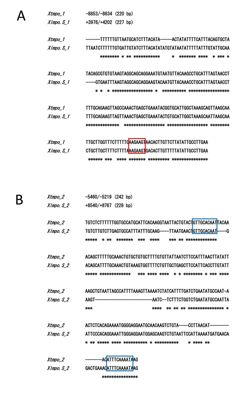 SFig. 1 Alignments of two conserved short sequences of the enhancer region with X. laevis mpo.S genome sequence X. tropicalis mpo The VISTA analysis found a similarity in the enhancer sequence (-10,442/4,753) of X. tropicalis to the first intron of Xlmpo.S but not to the genome sequence of Xlmpo.L. Out of 4 short sequences with high scores, 2 short sequnces contained the conserved binding sites of PU.1 and C/EBPα, which are the common transcription factors for myeloid lineages. (A) Xtmpo flanking sequence (-8,853/-8,634) is aligned with Xlmpo.S genome sequence in the first intron (+3,976/+4,202). Red box indicates a predicted sequence of PU.1 binding domain. (B) Xtmpo flanking sequence (-5,460/-5,219) is aligned with Xlmpo.S genome sequence in the first intron (+8,540/+8,767). Blue box indicates predicted sequences of C/EBPα binding domain. Astarisk shows the matched nucleotide in the two aligned sequences.