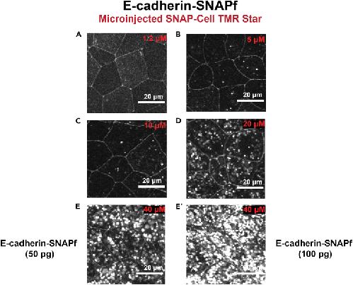 Figure 9. Dye and mRNA concentration optimization is necessary to reduce non-specific signal(A–E) Images of E-cadherin-SNAPf (50 pg) labeled with SNAP-Cell TMR Star ((A) 1.2 μM, (B) 5 μM, (C) 10 μM, (D) 20 μM, (E) 40 μM) through dye microinjections.(E′) E-cadherin-SNAPf (100 pg) labeled with 40 μM SNAP-Cell TMR Star.Scale Bars: 20 μm. |