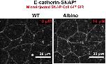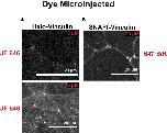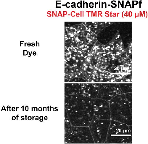 Figure 10. Non-desiccated SNAP-Cell TMR-Star dye aliquots can lose brightness following long-term storageE-cadherin-SNAPf (50 pg) labeled with SNAP-Cell TMR Star (40 M) (newly acquired, top) (long term storage, bottom). Scale Bars: 20 μm. |