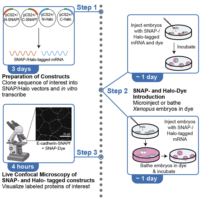 Figure 2. Dye introduction methods for labeling SNAPf- or Halo-tagged proteins expressed in intact Xenopus embryos(Top) SNAP/Halo dyes can be microinjected with SNAPf- or Halo-tagged mRNAs. (Bottom) After microinjecting SNAPf- or Halo-tagged mRNAs, embryos can also be bathed in SNAP/Halo dyes overnight (O/N, 15–22 h) for next-day imaging. |