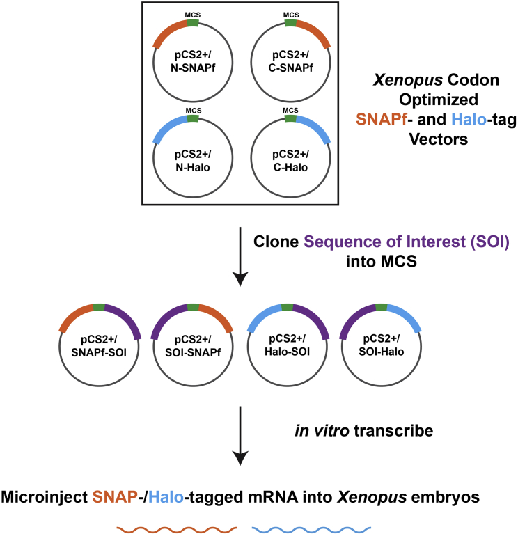 Figure 1. Workflow for expression of pCS2+/SNAPf- and Halo-tagged constructs in Xenopus embryospCS2+/SNAPf- and Halo-vectors that were codon optimized for Xenopus can be acquired from Addgene. The sequence of interest is cloned into the multiple cloning site (MCS), located upstream/downstream of the SNAPf/Halo-tag. Tagged constructs are in vitro transcribed to generate mRNA that is microinjected into 2–4 cell stage Xenopus embryos. |
