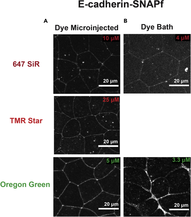Figure 4. Microinjecting or bathing embryos in dye can label E-cadherin-SNAPf in vivo(A) Images of Xenopus embryos expressing E-cadherin-SNAPf (50 pg) labeled via dye microinjection with SNAP-Cell 647 SiR (10 μM), SNAP-Cell TMR Star (25 μM), or SNAP-Cell Oregon Green (5 μM).(B) Images of Xenopus embryos expressing E-cadherin-SNAPf (50 pg) labeled via dye bath with SNAP-Cell 647 SiR (4 μM) or SNAP-Cell Oregon Green (3.3 μM).Scale Bars: 20 μm. |
