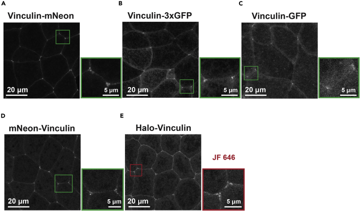 Figure 7. Halo-tag improves the visualization of difficult to image proteins compared with traditional fluorescent tags(A–E) Images of Xenopus embryos expressing (A) Vinculin-mNeon (10 pg), (B) Vinculin-3XGFP (30 pg), (C) Vinculin-GFP (10 pg), (D) mNeon-Vinculin (10 pg), and (E) Halo-Vinculin (10 pg) labeled with microinjected Janelia Fluor 646 HaloTag (5 μM).Scale Bars: 20 μm and 5 μm. |