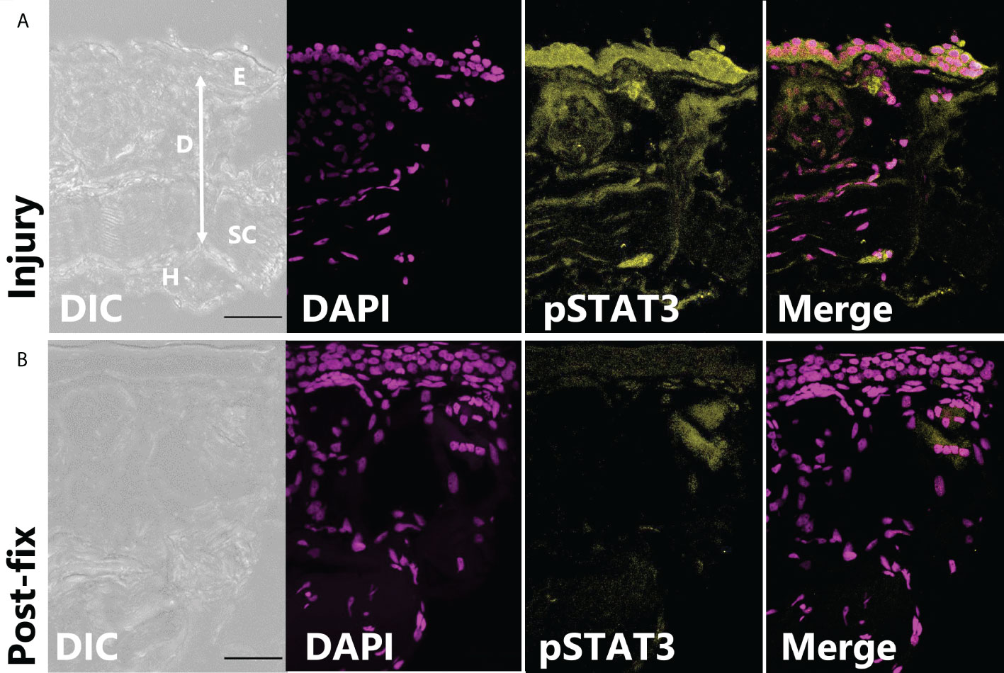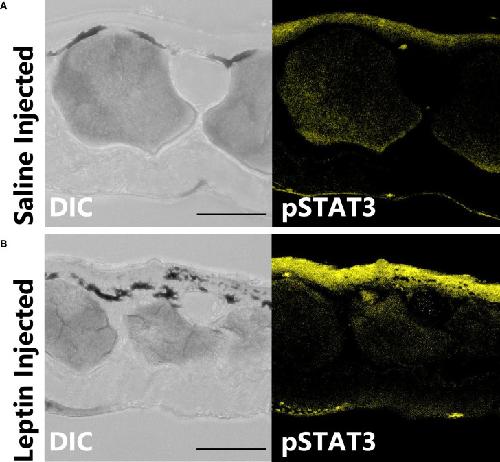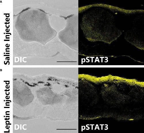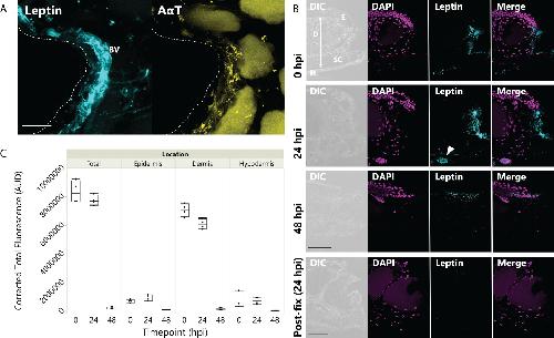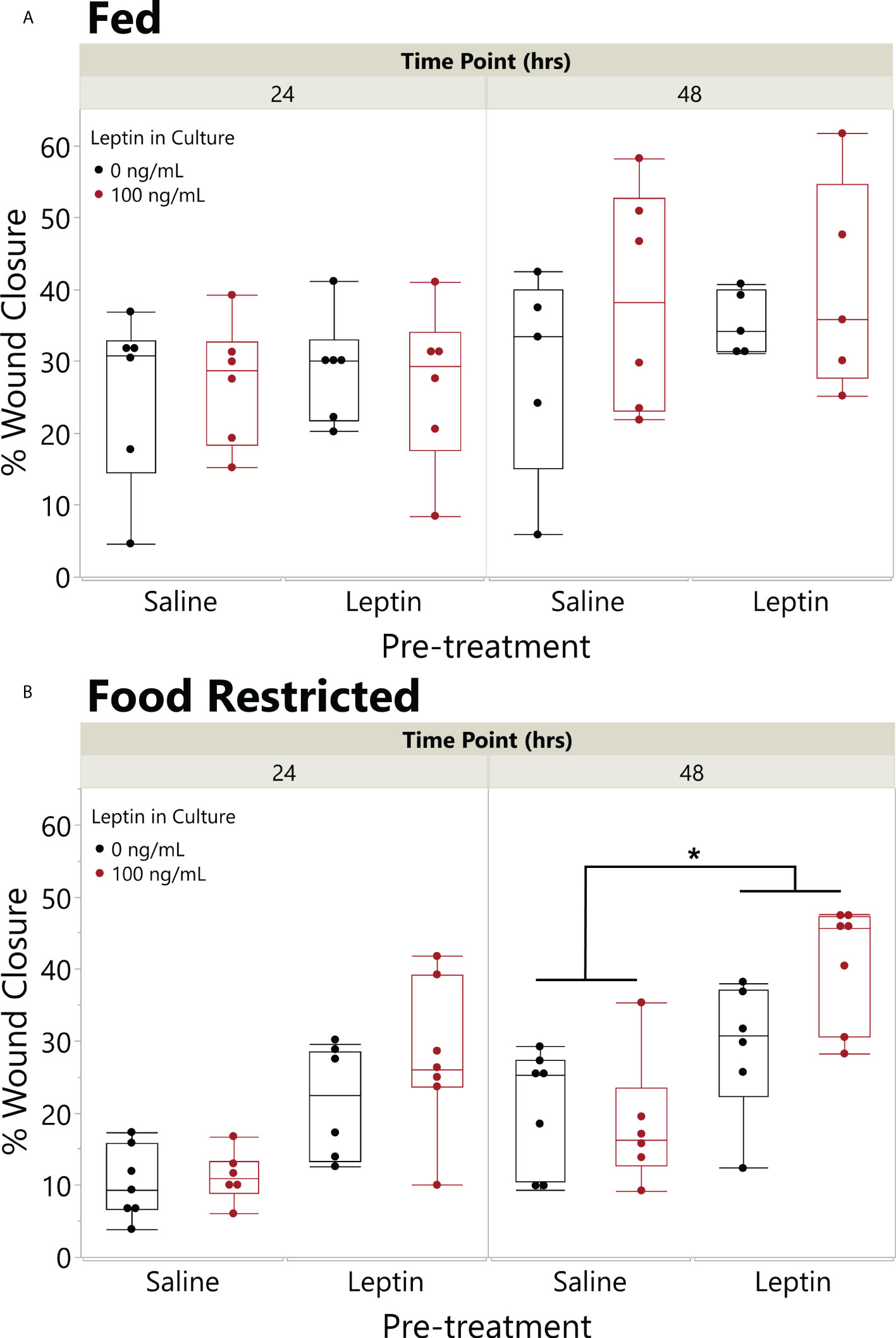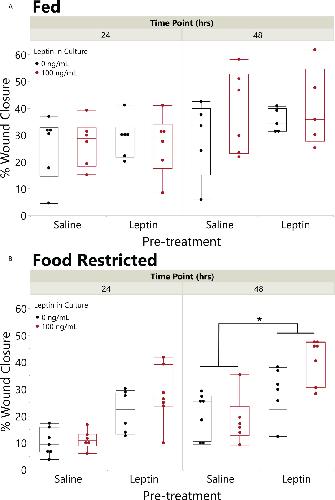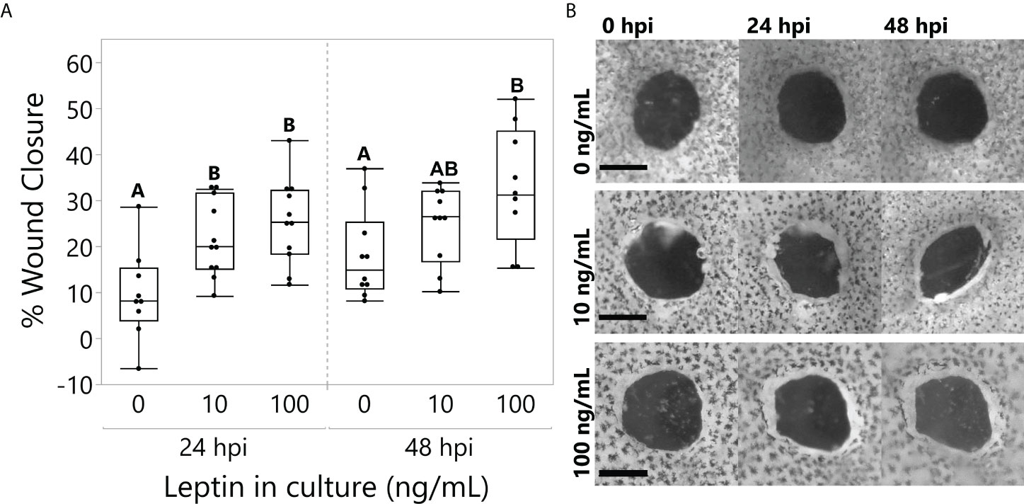 In mammals, the cytokine hormone leptin promotes wound healing by increasing inflammation, cellular recruitment, angiogenic regrowth, and re-epithelialization; however, it is not known whether leptin has conserved actions on wound healing in other vertebrates. Here, we tested the hypothesis that leptin promotes both the quality and speed of wound healing in the South African clawed frog, Xenopus laevis. First, fluorescent immunohistochemistry using a polyclonal antibody specific to Xenopus leptin showed that in juvenile dorsal skin, leptin protein is expressed in the dorsal epidermal layer, as well in blood vessel endothelial cells and sensory nerves that run along the base of the dermis. Injection of recombinant Xenopus leptin (rXleptin) stimulates phosphorylated STAT3 (pSTAT3), indicative of leptin-activated JAK/STAT signaling in the epidermis. Similar to mammals, leptin protein expression increases at the wound site after injury of the epidermis. We then cultured "punch-in-a-punch" full-thickness dorsal skin explants in three doses of rXleptin (0, 10, and 100 ng/ml) and showed that leptin treatment doubled the rate of wound closure after 48 h relative to skin punches cultured without leptin. Food restriction prior to wound explant culture reduced the amount of wound closure, but leptin injection prior to euthanasia rescued closure to similar control levels. Leptin treatment also significantly reduced bacterial infection of these epidermal punches by 48 h in culture. This study shows that leptin is likely an endogenous promoter of wound healing in amphibians. Leptin-based therapies have the potential to expedite healing and reduce the incidence of secondary infections without toxicity issues, the threat of antibiotic resistance, or environmental antibiotic contamination. The conservation of leptin's actions on wound healing also suggests that it may have similar veterinary applications for other exotic species.