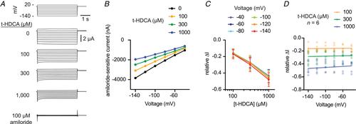Figure 6. ENaC regulation by t-HDCA is voltage-independent. A, oocytes expressing α, β and γ ENaC subunits were bathed in a 110 mM Na+ solution supplemented with t-HDCA or amiloride as indicated. After 60 s for each t-HDCA dose, or 20 s for amiloride, currents were recorded while varying voltage in 20 mV steps for 4 s, as shown in the representative experiment. Steady-state currents at each voltage (recorded at 3.8 s) were subsequently analysed. B, the amiloride-sensitive I–V curve from the representative experiment is plotted for each t-HDCA dose. C, the relative t-HDCA dose–response at each voltage is plotted and was determined as ∆I = IX/I0 – 1, where I0 and IX are the amiloride-sensitive currents at baseline and a given t-HDCA dose, respectively. Data shown are means (SD), n = 6 oocytes. D, the t-HDCA dose–response data were replotted as a function of voltage, with individual measurements shown as coloured circles. Data at each voltage were fit by linear regression, with values of R2 = 0.001, 0.005 and 0.03 for 100, 300 and 1000 μM t-HDCA, respectively. None of the slopes were significantly non-zero: P = 0.83 for 100 μM t-HDCA, P = 0.68 for 300 μM t-HDCA and P = 0.28 for 1000 μM t-HDCA. [Colour figure can be viewed at wileyonlinelibrary.com]
