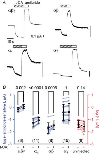 Figure 4. Effect of subunit composition on ENaC response to t-CA. A, currents from Xenopus oocytes expressing ENaC subunits shown were assessed by two-electrode voltage clamp at -100 mV. Recordings were performed in a buffer containing 110 mM Li+, and supplemented with 1 mM t-CA or 100 μM amiloride, as indicated. Currents at baseline and in the presence of t-CA or amiloride were measured at the end of each treatment period. B, amiloride-sensitive currents (blue) in the absence (–) or presence (+) of t-CA were transformed as log(-current) and plotted. Absolute currents (red) were similarly plotted for uninjected oocytes. Summary statistics are means (SD). Transformed amiloride-sensitive currents were analysed by repeated measures two-way ANOVA, with Sidak's multiple comparisons test to examine the effect of t-CA. Transformed absolute currents from uninjected oocytes were analysed by paired Student's t test. The number of oocytes measured for each group is shown in parentheses. [Colour figure can be viewed at wileyonlinelibrary.com]