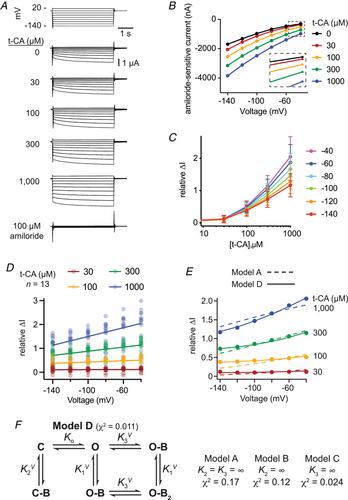 Figure 5. ENaC regulation by t-CA is voltage-dependent. A, oocytes expressing α, β, and γ ENaC subunits were bathed in a 110 mM Na+ solution supplemented with t-CA or amiloride as indicated. After 60 s for each t-CA dose, or 20 s for amiloride, currents were recorded while varying voltage in 20 mV steps for 4 s, as shown in the representative experiment. Steady-state currents at each voltage (recorded at 3.8 s) were subsequently analysed. B, the amiloride-sensitive I–V curve from the representative experiment is plotted for each t-CA dose, with an inset highlighting greater relative stimulation at less negative potentials. C, the relative t-CA dose–response for each voltage is plotted and was determined as ∆I = IX/I0 – 1, where I0 and IX are the amiloride-sensitive currents at baseline and a given t-CA dose, respectively. Data shown are means (SD), n = 13 oocytes. Individual points are shown in panel D. D–E, the t-CA dose–response data were replotted as a function of voltage, with individual data points in D and mean values in E. Linear regression was performed for each t-CA dose (D), and gave R2 values of 0.19 for 30 μM t-CA (P = 0.38), 0.98 for 100 μM t-CA (P = 0.0002) and 0.99 for both 300 and 1000 μM t-CA (P < 0.0001). F, relative ∆I vs voltage data were fit to various models of regulation. The simplest model considered (Model A, dashed lines in panel E) had three states, a closed state (C), an open state (O), and an open state with the bile acid bound at one site (O-B). Equilibrium constants between these states are Ko = [O]/[C] and K1 = [O][B]/[O-B], and K1 was permitted to have voltage-dependence according to K1V = K1·ezFδV/RT. Additional binding sites were defined analogously. Models A, B and C are nested within Model D by setting the indicated binding constant(s) to ∞. The fit to the best model (Model D, solid lines in panel E) is shown. [Colour figure can be viewed at wileyonlinelibrary.com]