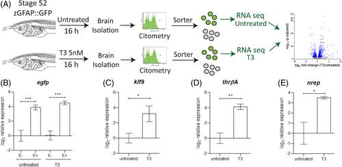 Figure 1. Isolation and characterization of EGFPâ and EGFP+ cells from the zGFAP::EGFP transgenic tadpoles treated with T3. (A) Stage 52 tadpoles were exposed to control (untreated) and 5 nMT3 solutions for 16âhours. The whole brain was isolated and disaggregated with Papain and individual EGFPâ and EGFP+ cells were sorted by cytometry. Total RNA was isolated from unsorted cells, EGFPâ cells and EGFP+ cells. (B) RT-qPCR for egfp in EGFPâ cells (Eâ) and EGFP+ cells (E+) of RNA samples isolated from untreated and T3-treated tadpoles. The expression of egfp was normalized to eef1a1 and compared to the Eâ condition in four independent biological replicates and plotted as log2-expression. ***P <â0.001, ANOVA with Sidak's multiple comparisons test between Eâ and E+ for control and T3 conditions. (CâE) The expression of klf9 (C), thrβA (D) and nrep (E) was analyzed by RT-qPCR in isolated brain EGFP+ cells from control and T3-treated tadpoles. The expression of each gene was normalized to eef1a1 and compared to the control condition in 3 (nrep) or 4 (klf9 and thrβA) independent biological replicates and plotted as log2-expression. *P <â0.05, **P <â0.01, unpaired Student's t-test.